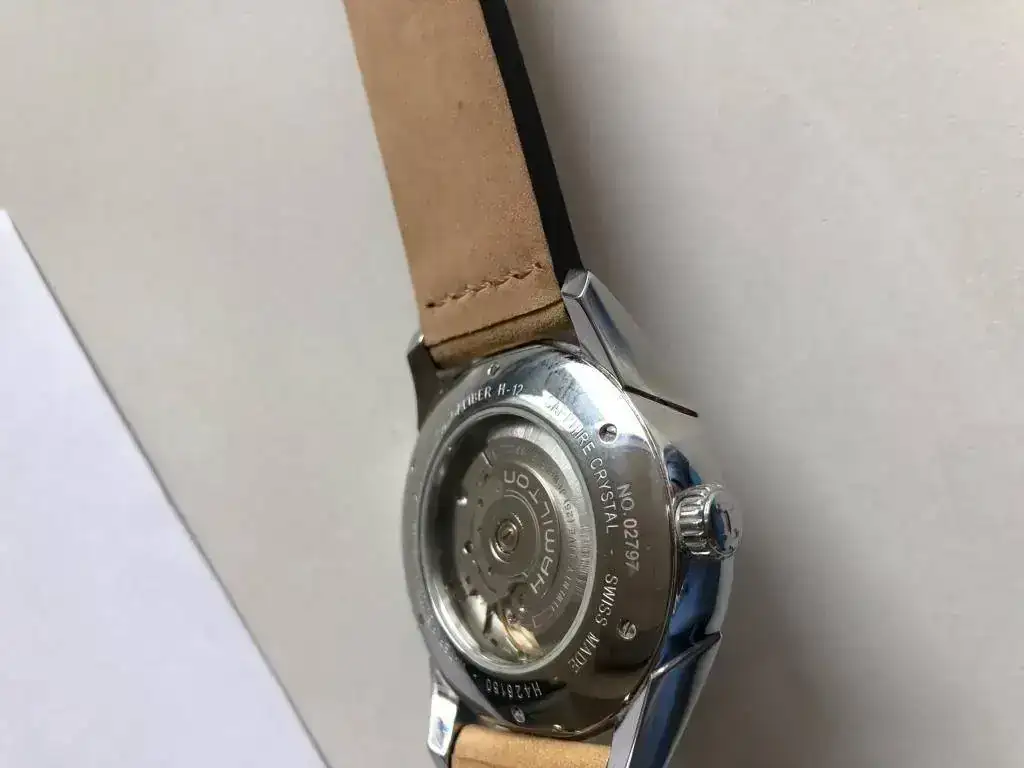 Lleva un calibre H12 automatico, cristal de zafiro y es una edición limitada y numerada. No conservo la tarjeta y lo entrego en un estuche Hamilton que no es el suyo.