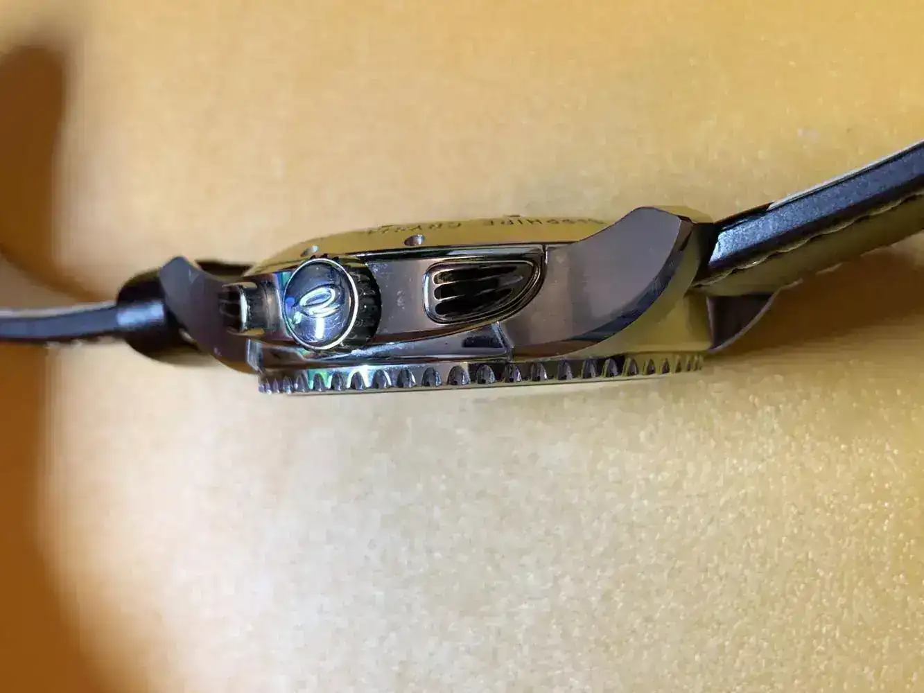 El reloj está en muybuen estado. Con pequeños pelillos en las zonas pulidas a espejo, que apenas senotan y en el pulsador inferior del crono, una de las tres rayitas pintadas ennegro parece que le falta un pelo de pintura.