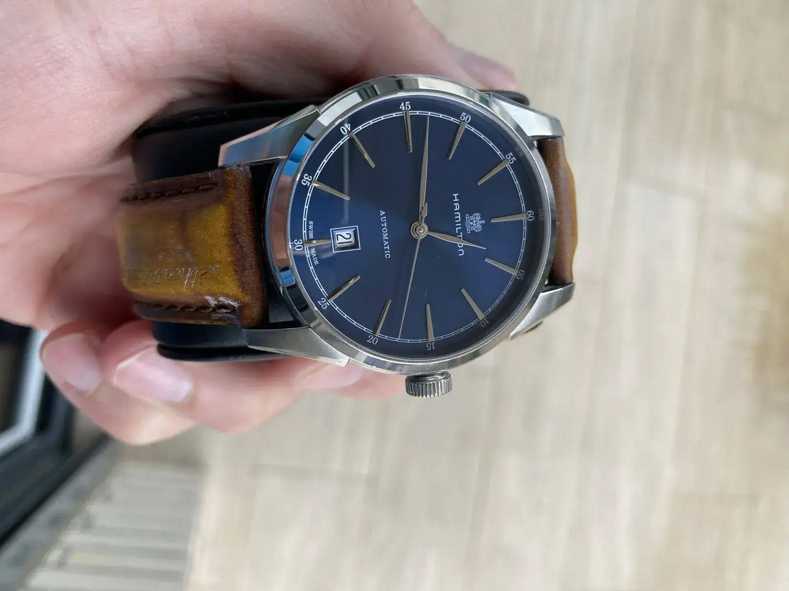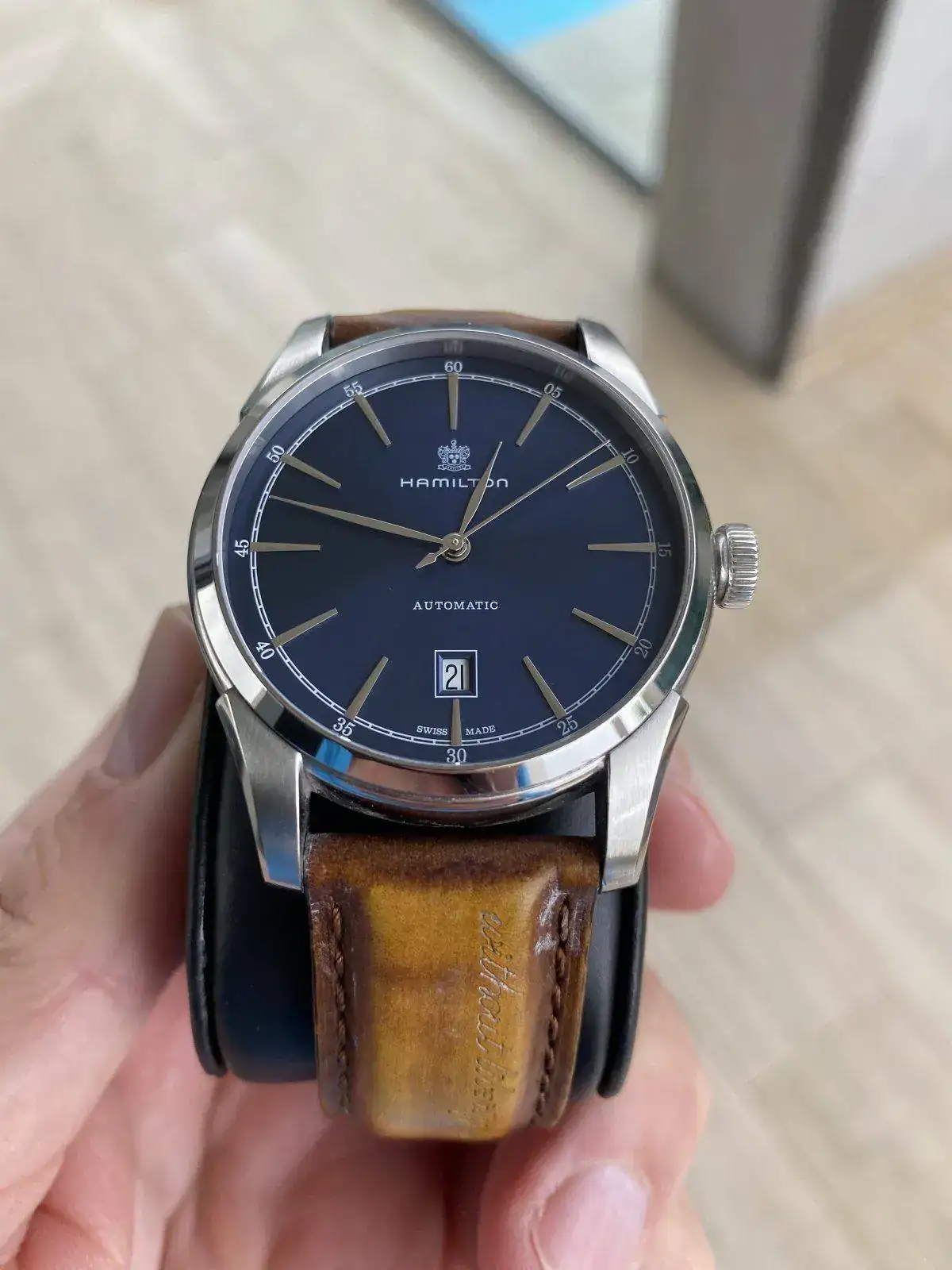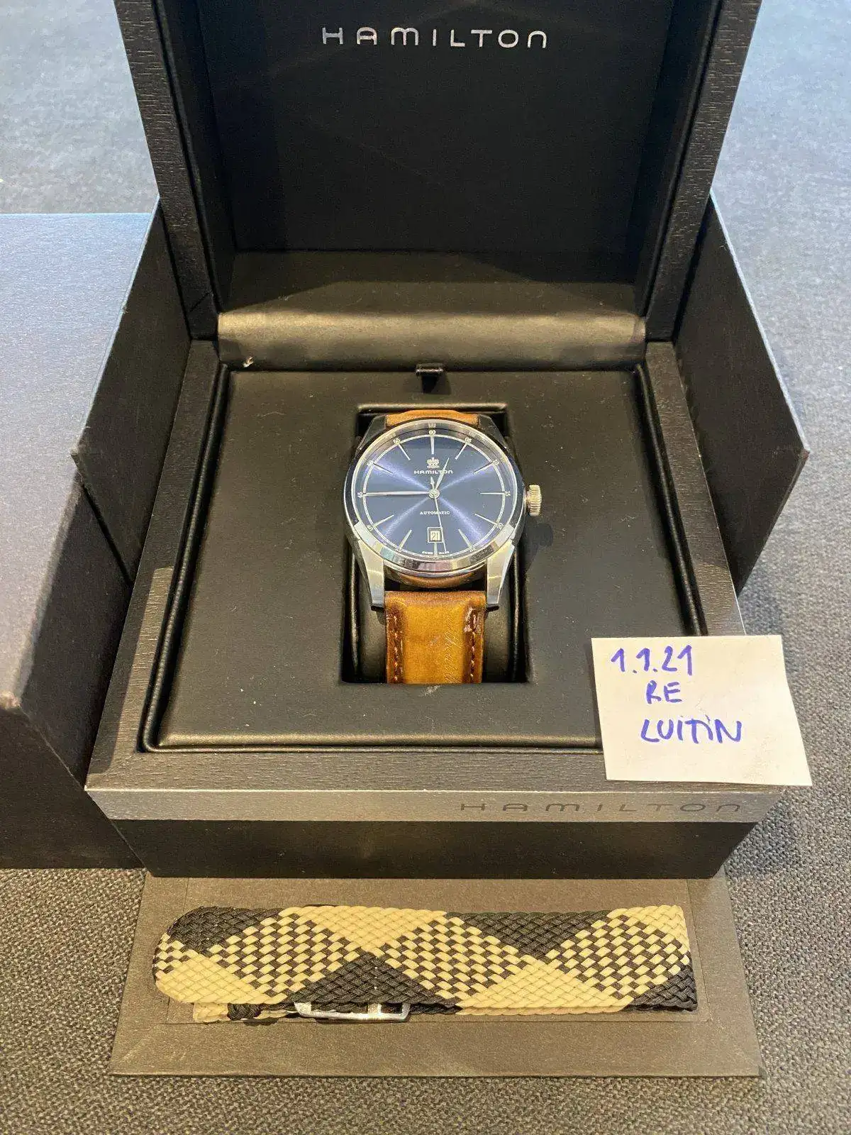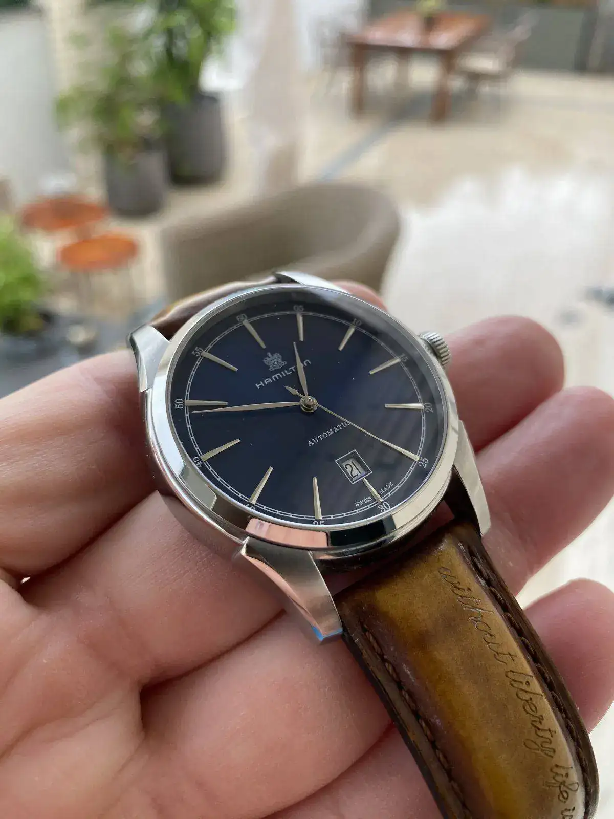 Buenos dias, Saco a la venta este precioso reloj Hamilton de la colección Timeless Classic, Spirit of liberty. Monta el movimiento H-10 con 25 rubis de Hamilton y 80 horas de reserva de marcha, con rotor esqueletizado y visto gracias al fondo de cristal. Correa de piel con grabación de serie "without liberty life is a misery" y hebilla desplegable, fondo visible y cristal de zafiro, esfera azul espectacular con matices segun incida la luz. Nada destacable sobre su estado, es excelente. Regalo correa marron nato para hacerle un look diferente