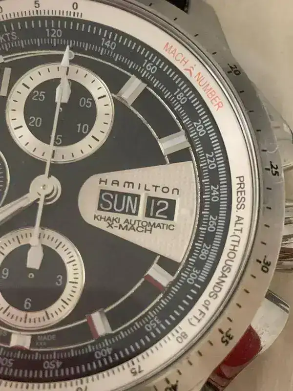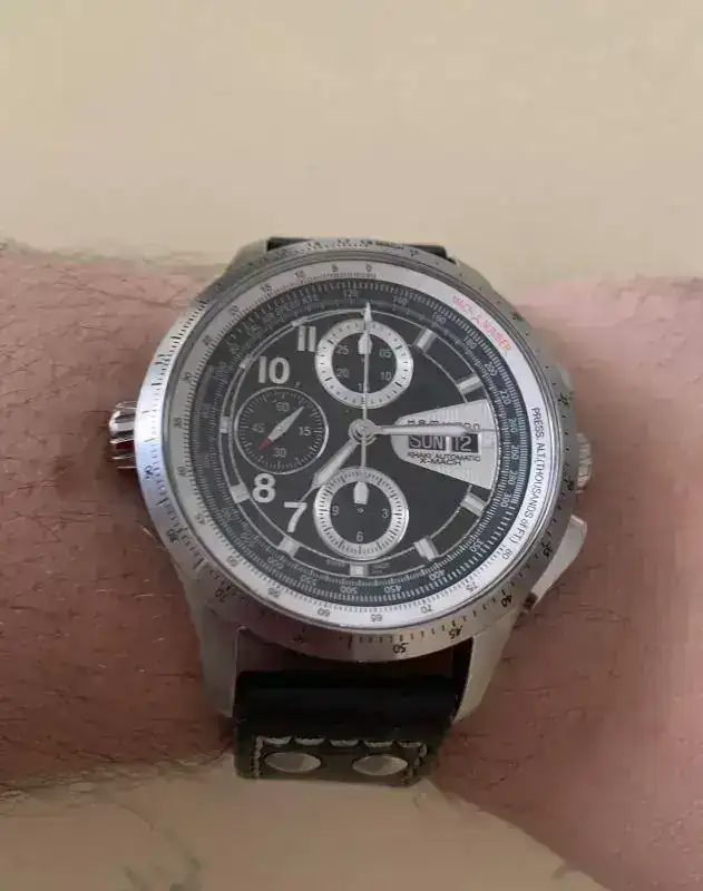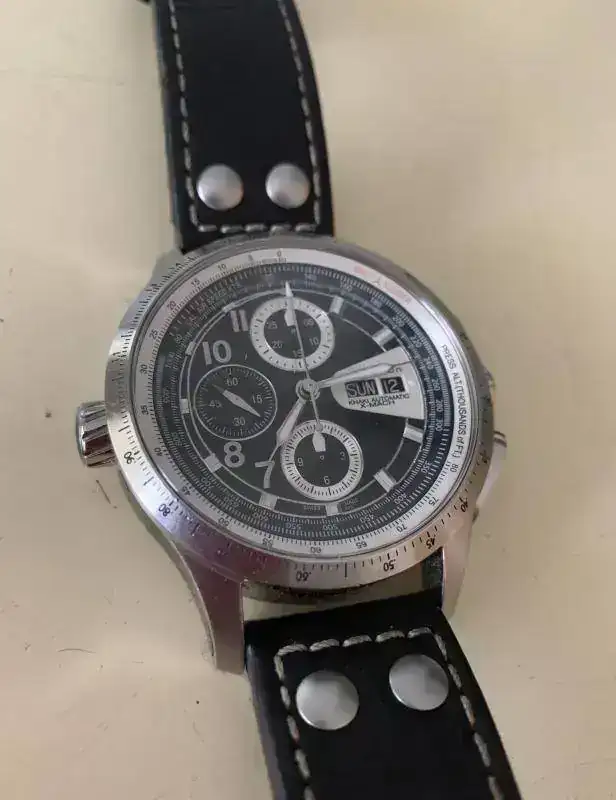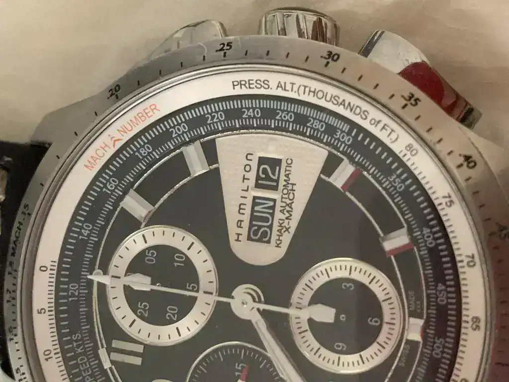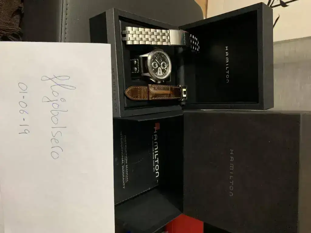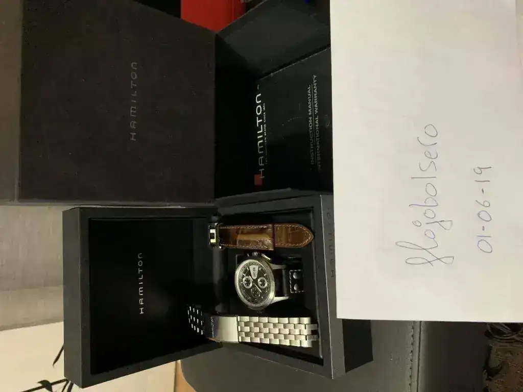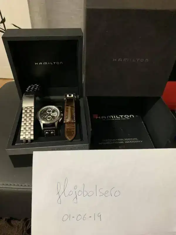 Buenos días. Saco a la venta un poco visto Hamilton x-mach;crono automático, primo hermano del x-wind. El reloj está usado y puede apreciarse en los típicos pelillos del bisel, pero no tiene golpes ni nada parecido. Añado 3 correas. La marrón tiene uso pero creo que aún puede usarse. La negra tiene menos uso pero mencionar que tiene hechos dos agujeros más, y la de acero está usada, pero con un cepillado quedaría nueva. Teniendo todo esto en cuenta le pongo un precio bastante acorde,en mi opinión, de 610€ con el envío incluido por mrw sin asegurarar.tambien puedo entregarlo en mano por madrid sur. En principio podría aceptar como parte de pago un Certina DS action o un Hamilton belowzero en acero, pero escucharé propuestas de cambio.cualquier cosa podéis escribirme un mp.