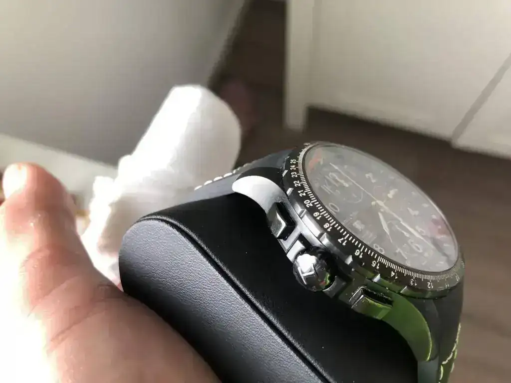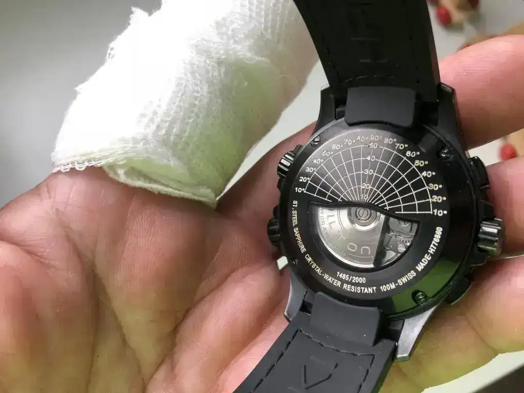 CAJA: De acero inoxidable con tratamiento PVD totalmente estanca, serial y marca registrada en parte posterior semi-transparente con cristal de zafiro. Corona roscada a la caja.