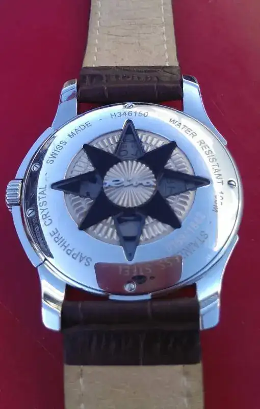Este modelo en concreto es el que trae la complicación GMT. Su esfera es de color teca, con lineas longitudinales amarillas, como la cubierta de las famosas lanchas, y de fondo un mapa mundi. La tapa trasera es una preciosidad. En ella, hay una rosa de los vientos en vidrio negro y transparente con el logo de Riva en el centro y que deja entrever el movimiento.