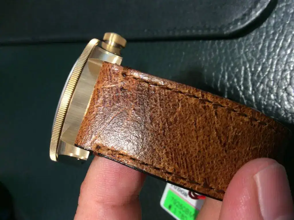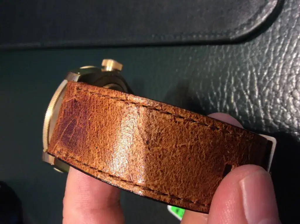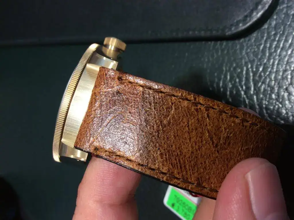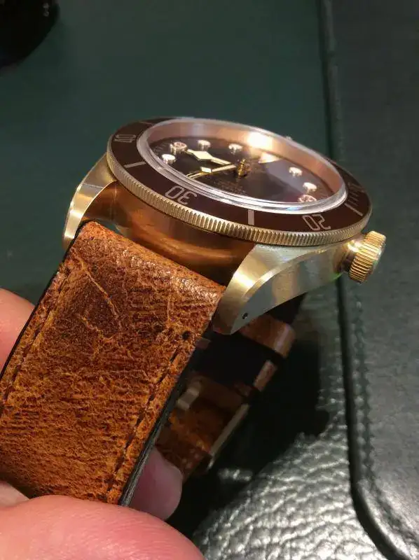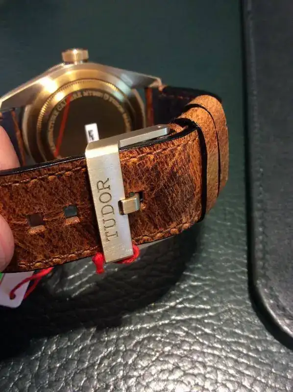 Pedazo de correa y pedazo de hebilla. La tapa trasera es acero con una capa PVD que imita el tono de bronce hacia el que Tudor espera que evolucione: