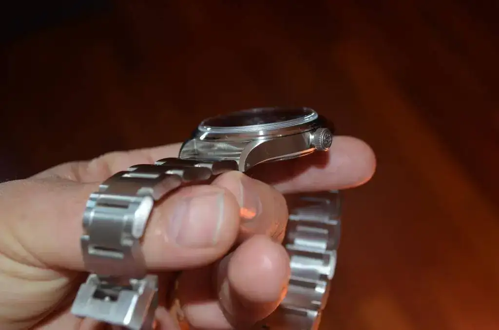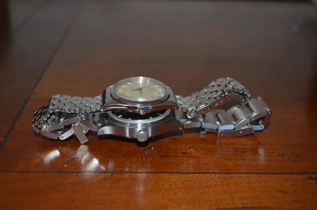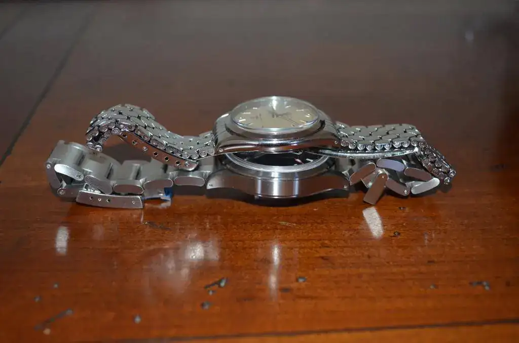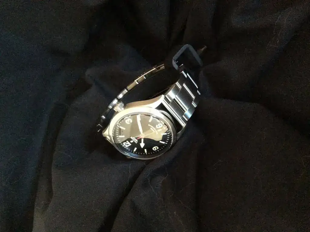 Se trata de un reloj sin fecha, con 41mm de caja, todo cepillado salvo el bisel. Con un brazalete en acero inoxidable sin endlinks. Es un reloj muy contundente. En vivo se aprecia más grande de lo que su medida sugiere, debido quizás a la delgadez del bisel.