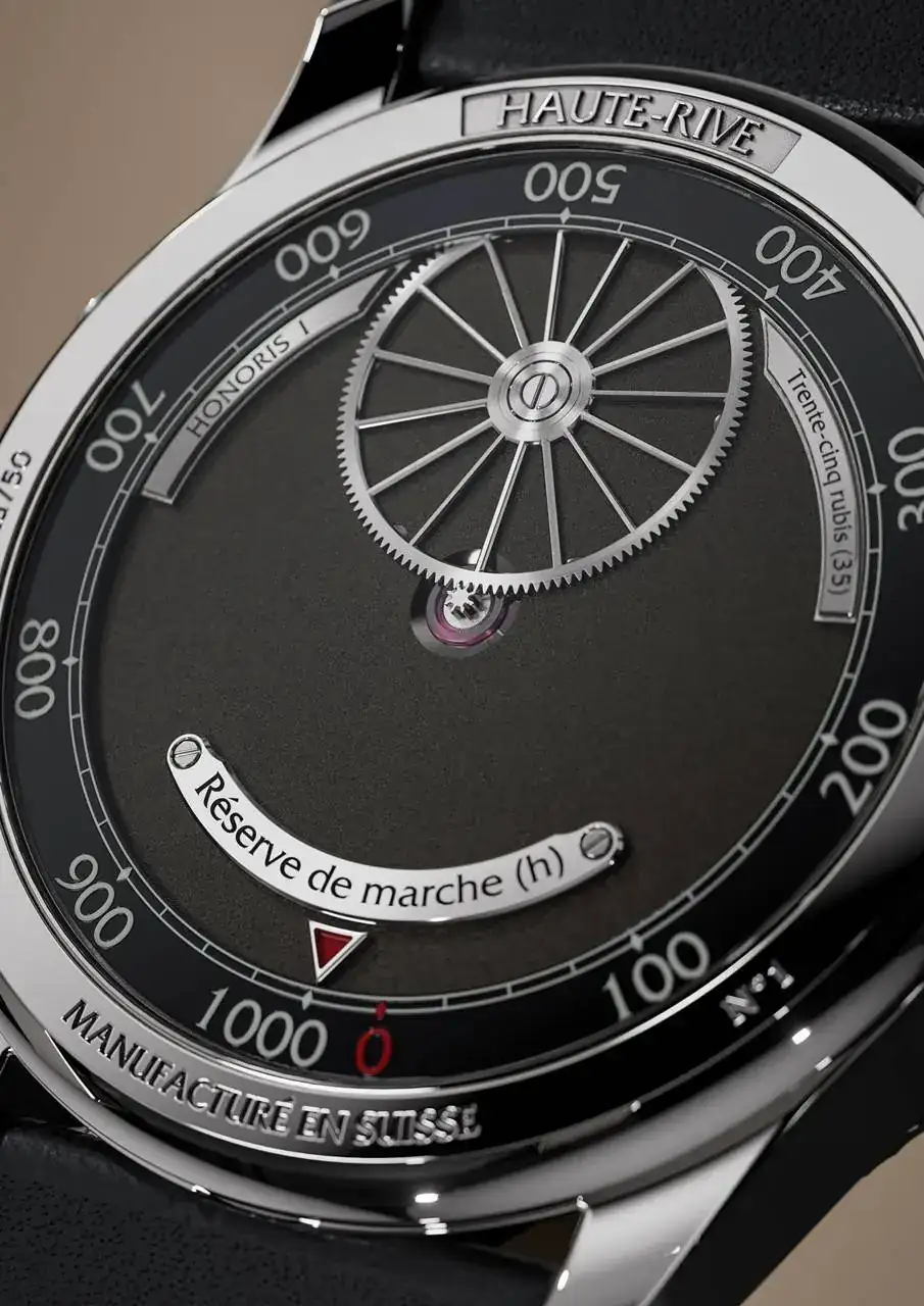 Para alcanzar el objetivo de una reserva de marcha de 1.000 horas para el calibre HR01, Stéphane von Gunten aumentó al máximo el tamaño del muelle real, preservando al mismo tiempo las dimensiones generales del reloj. Por lo general, los relojes que ofrecen 10 días de funcionamiento son bastante voluminosos, y a menudo presentan diseños futuristas por laimposibilidad de hacerlos "elegantes". Honoris I fue concebido con el espíritu más clásico de portabilidad. Por eso Stéphane von Gunten optó por un único muelle real. Aumentar su tamaño significaba que la pletina actuara como barrilete. Diseñado a medida por un especialista en este campo, este muelle real tiene una longitud de 3 metros, sin duda el más largo jamás instalado en un reloj de pulsera. Para ofrecer el par más suave posible, está equipado con una brida deslizante que evita sobretensiones. La brida deslizante también protege el tren de engranajes cuando el muelle está completamente armado.