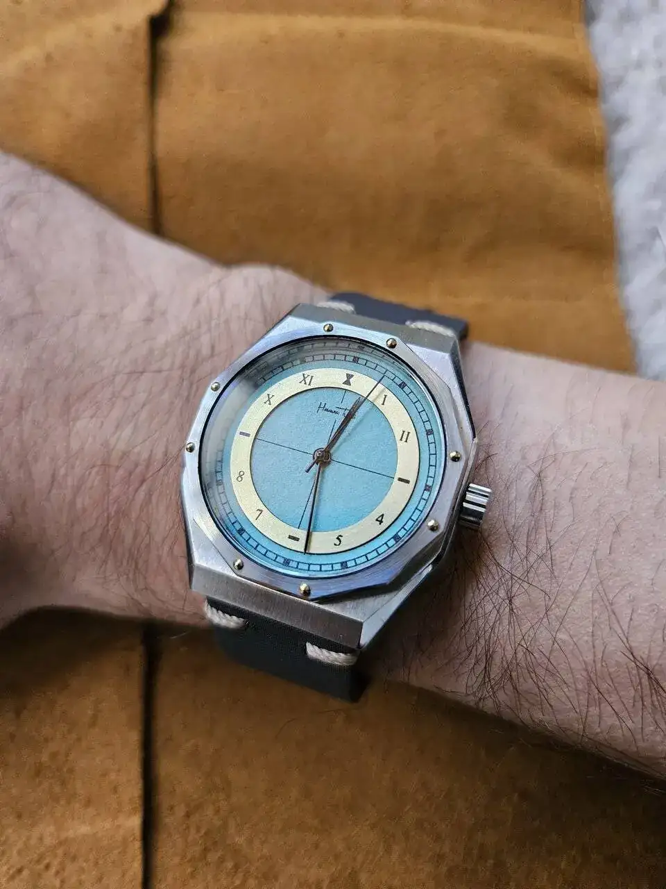 Lo que me cautivó fue que era una caja NOS de los años 70 y un movimiento suizo vintage y un dial hecho a mano. Todo montado a mano, además, por un relojero, en su taller. En el instagram de Eric Yeh se pueden ver varios vídeos de como hace las esferas, tiñendo papel tradicional de algodón chino, del que se usa para caligrafía.