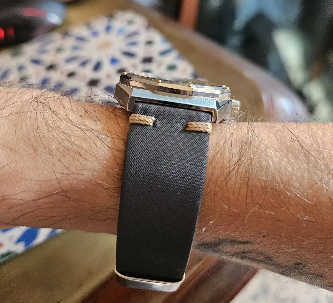 El brazalete es vintage y me lo esperaba peor, no lo veo tan malo. Pero aún no he podido ajustarlo. También viene con una correa de micro fibra hecha a mano que no me parece la bomba, pero tampoco mala, y como punto a favor no es una generica de aliexpress , nunca había visto una exactamente igual.