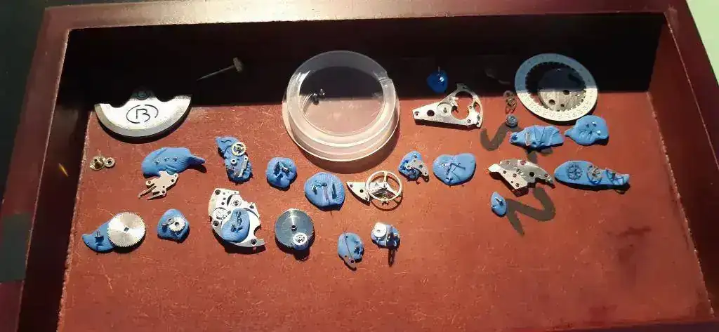 Tampoco tenía las herramientas adecuadas para soltar un tubito que entra en un engranaje y para soltar unas joyas que tienen unas cosas raras encima y el escape los muelles tampoco los he desarmado. Así que el desmontaje sólo ha cubierto un 95 % de las piezas. Aproximadamente.