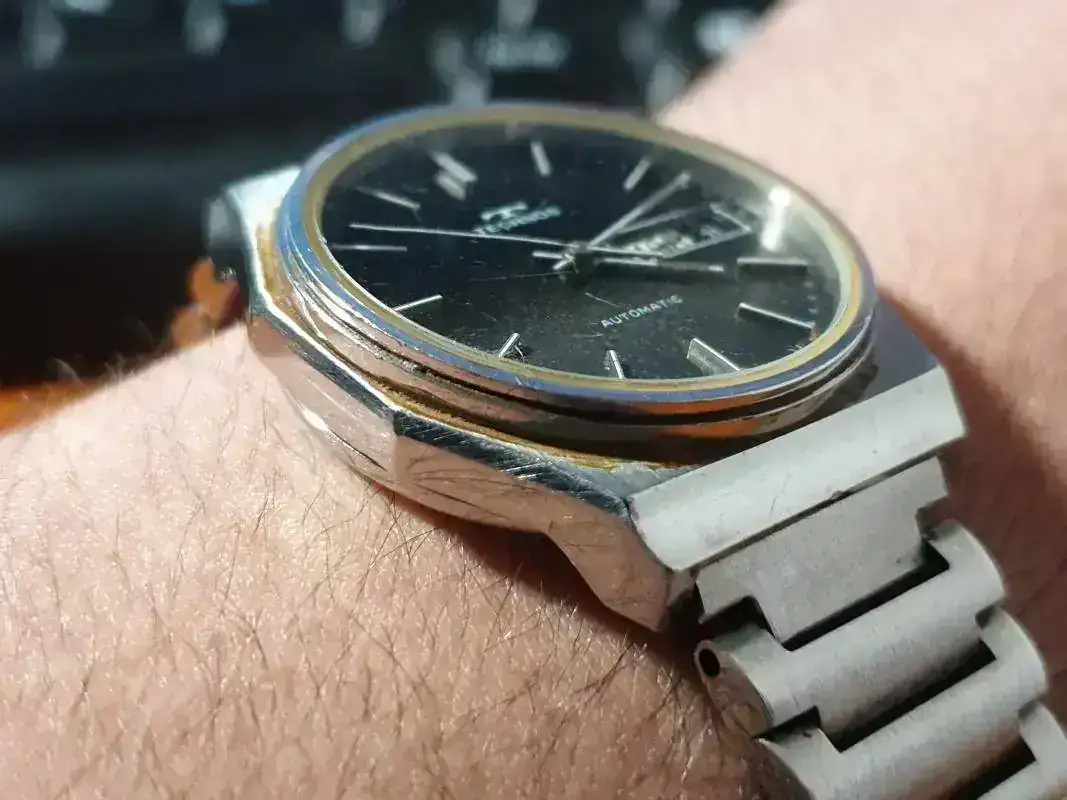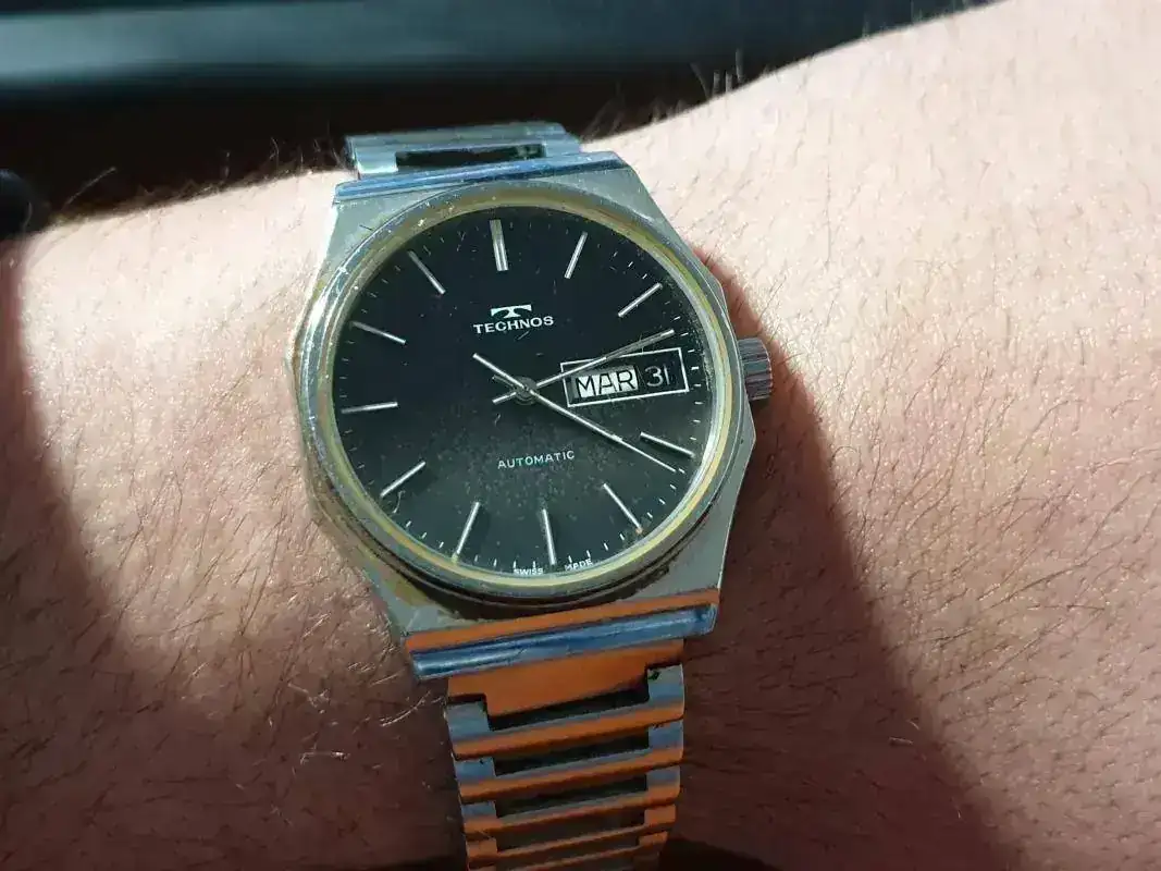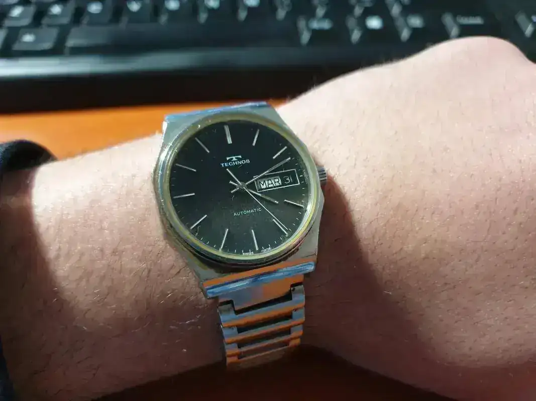 Resulta que antes de que ocurriese lo que está pasando, estábamos preparando una mudanza. El caso es que, recogiendo cosas, mi madre encontró un reloj Technos automático en un cajón.Al parecer perteneció a mi abuelo, así que imediatamente lo he acogido en mi "colección". El reloj funcionaría a la perfección si no fuese porque una de las agujas está ligeramente torcida, y cuando la de los minutos está entre 25-30, la de los segundos se atasca durante un segundo o dos.