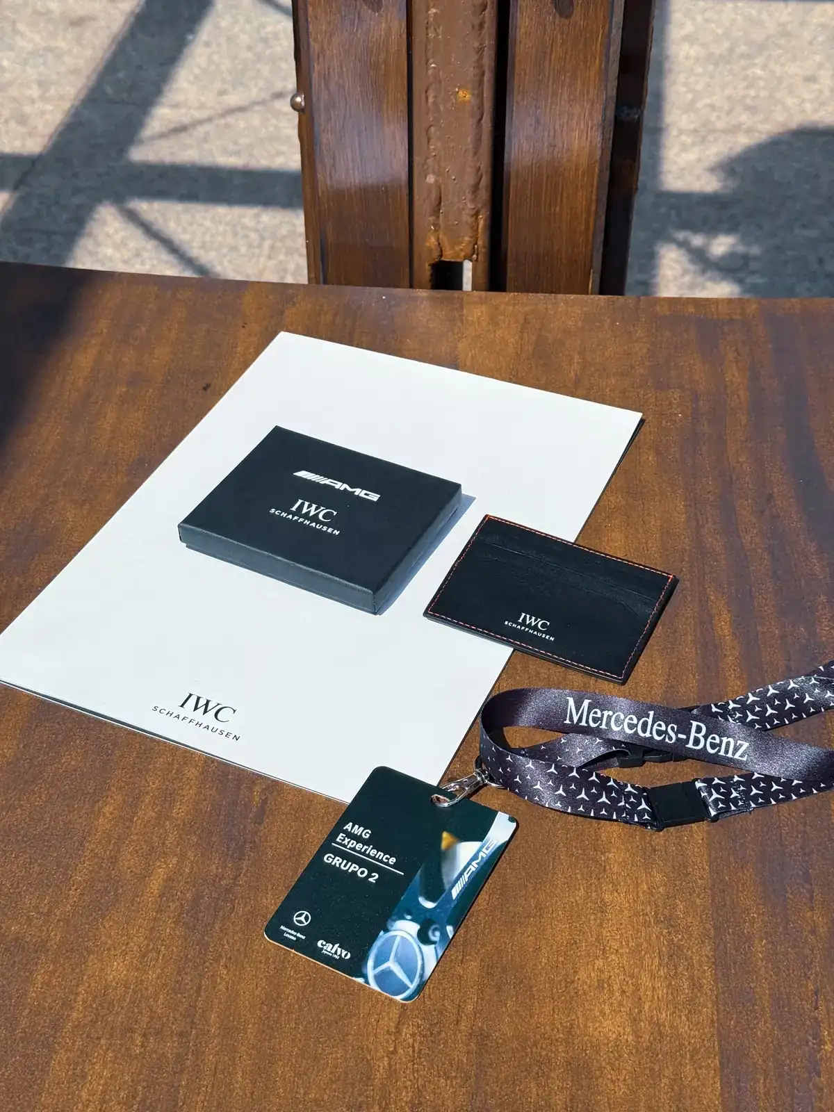 Llegamos y en la entrada, nos reciben con un obsequio por parte de AMG y IWC, un tarjetero de piel, con las acreditaciones...