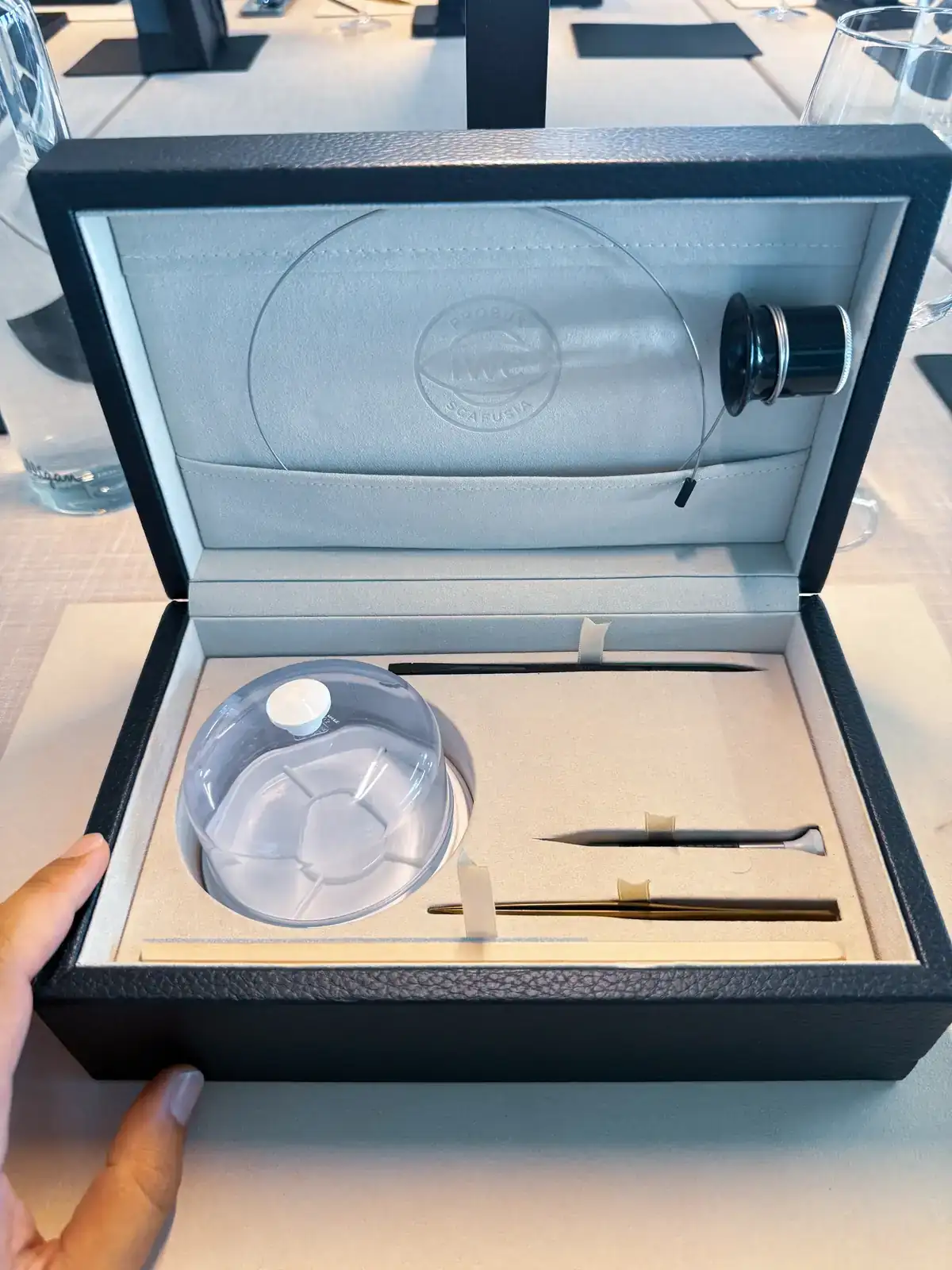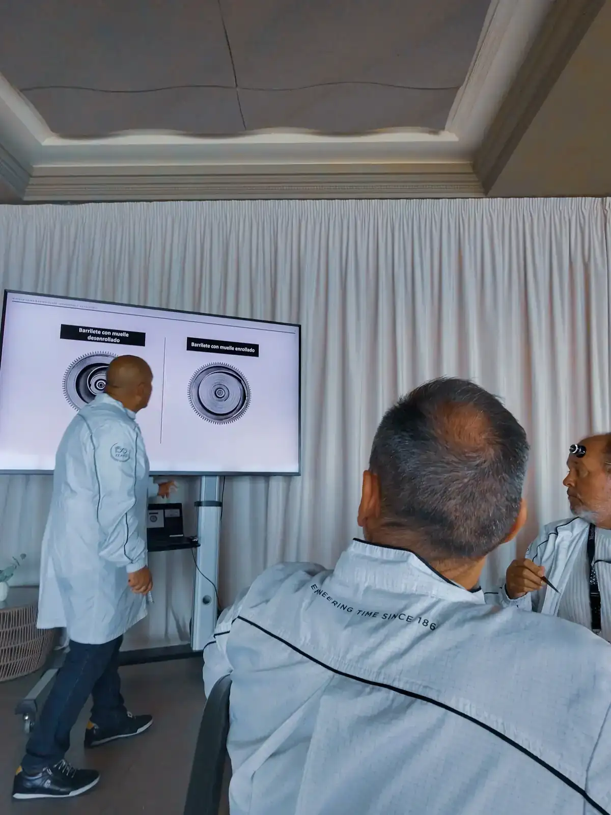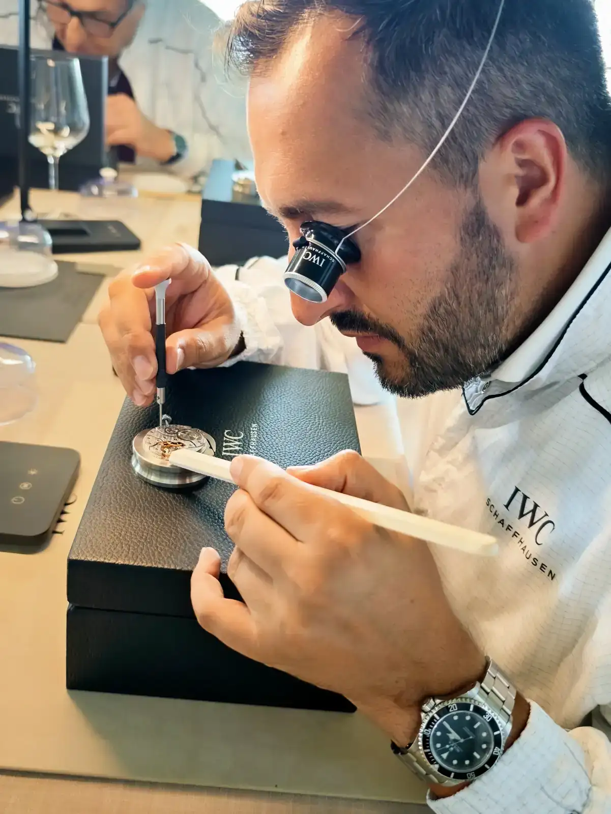Una vez terminamos de probar todos los AMGS, con la adrenalina bien arriba, es el turno de entrar en la zona de IWC que nos había preparado Joyería Calvo. Volvemos a la zona de presentación inicial y nos sueltan el bombazo: "Hoy vais a ser relojeros por unas horas, y vais a estar dirigidos en todo momento por el maestro de IWC Rogelio ! Vais a montar un calibre"