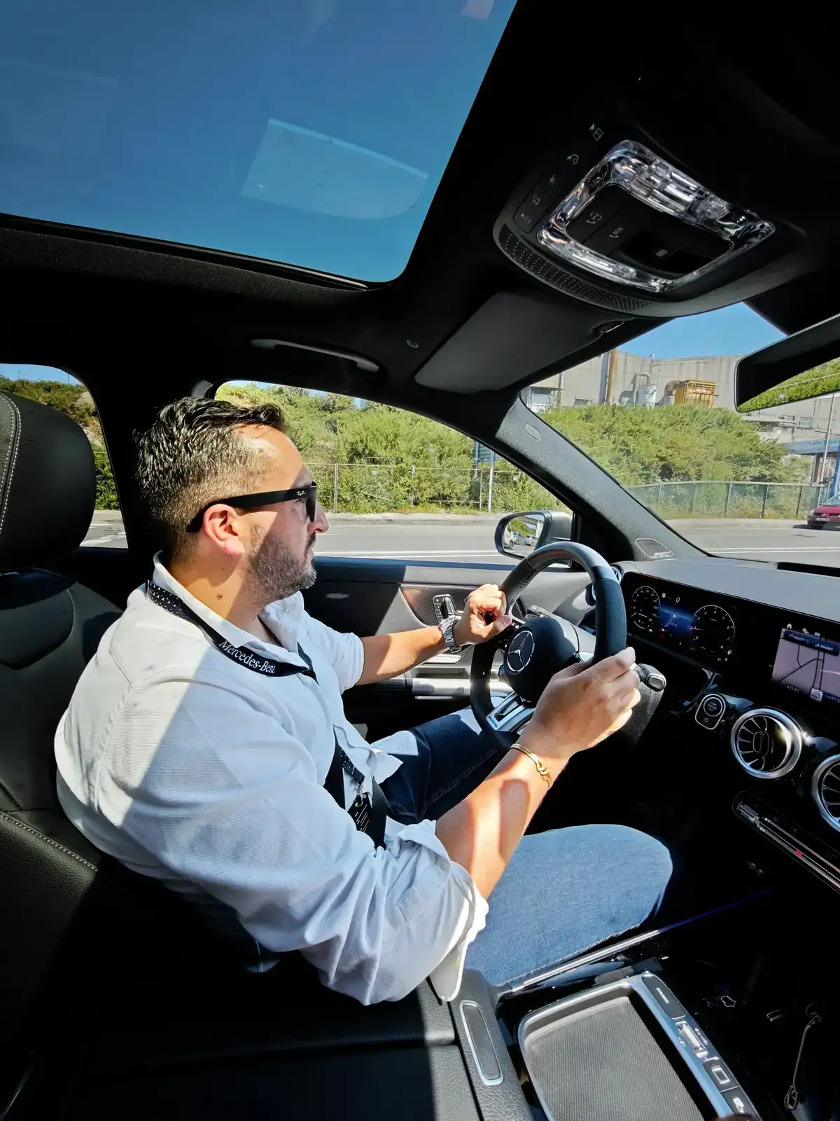Salimos a la zona de recepción de vehiculos y nos encontramos todo tipo de AMG's de hasta 640 Cv de potencia, (lo siento, no me quede con todos los modelos porque ibamos con un pelín de retraso, y nos iban explicando por los walkies sobre la marcha). Cada integrante del grupo2 nos subimos a un coche aleatorio y nos ibamos rotando cada 15-20 minutos para poder probar todos: AMG SUV electrico, deportivos, familiares... me enamoré de las suspensiones de estos coches...