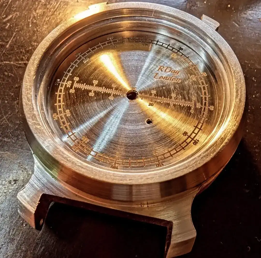 Si nos fijamos, el mecanizado de la caja es absolutamente lamentable. Una es de latón y la otra de aluminio, ambas hechas a mano por Richard Day en Wimbledon. Con "a mano" entendamos que no están hechas con CNC; Richard empezó fabricando telescopios artesanales, y en algún momento se le ocurrió hacer cajas de reloj inspiradas en esos telescopios, utilizando la misma técnica para darles forma.