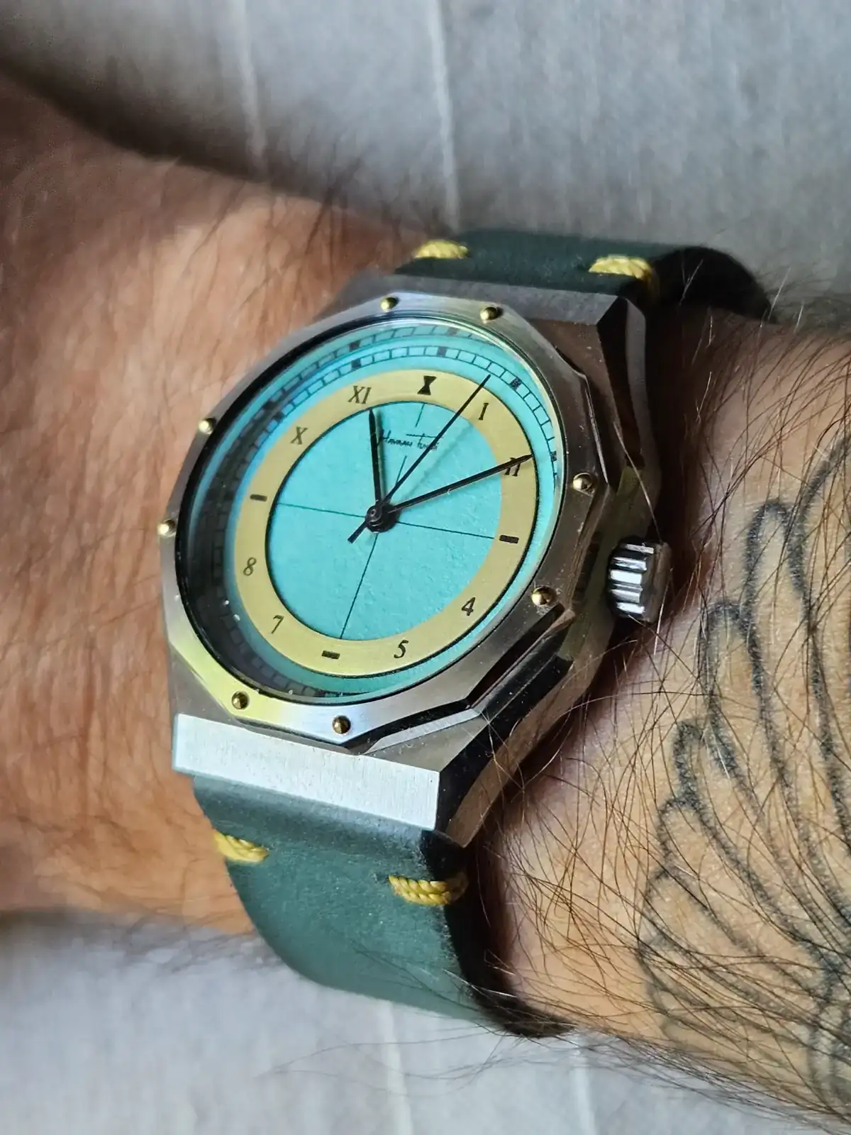 El último protagonista de hoy es este Havaan Tuvali con un dial de papel de algodón chino. Eric Yeh corta un circulito del mentado papel, lo sumerge en pintura, después estampa el logo de la marca y las líneas del "sector dial", por último corta un aro de latón donde ha previamente grabado los numerales, y con todo ello conforma este dial. En palabras de un buen amigo "es como si lo hubiera hecho yo".