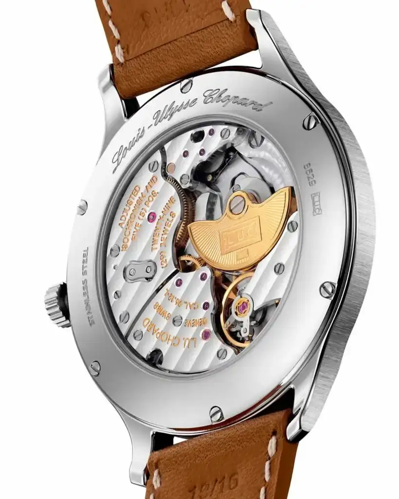Este Chopard tiene un biselado en los puentes redondeado y precioso, cuesta unos 12 mil euros, pero está hecho a máquina. Hay otra versión del mismo calibre con el sello Qualité Fleurier que posiblemente sí tiene "anglage" o biselado a mano, pero es muchísimo más caro (nos vamos a los 20 mil francos suizos en acero). Os dejo foto para que comparemos: