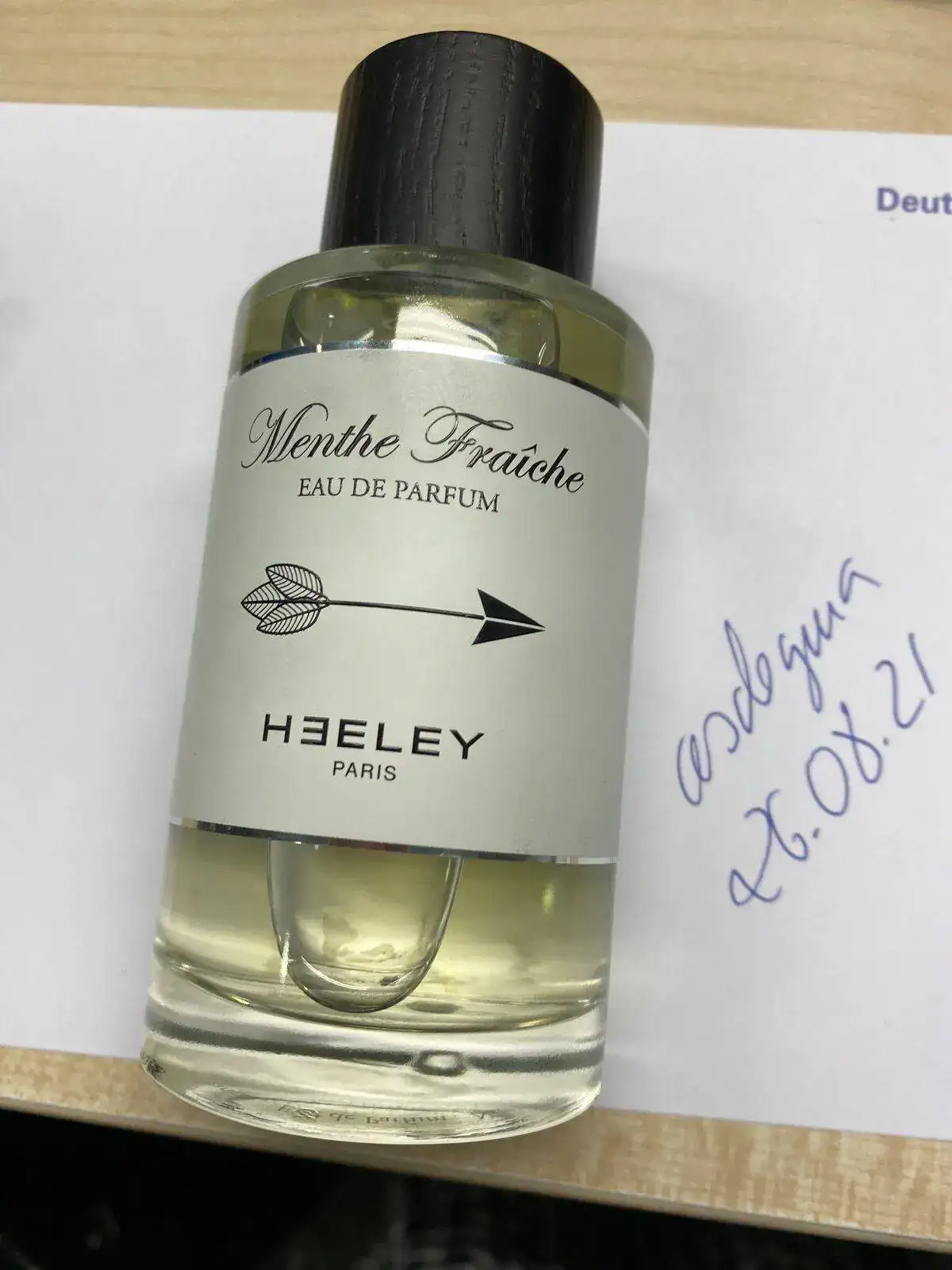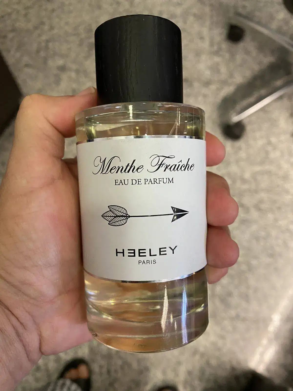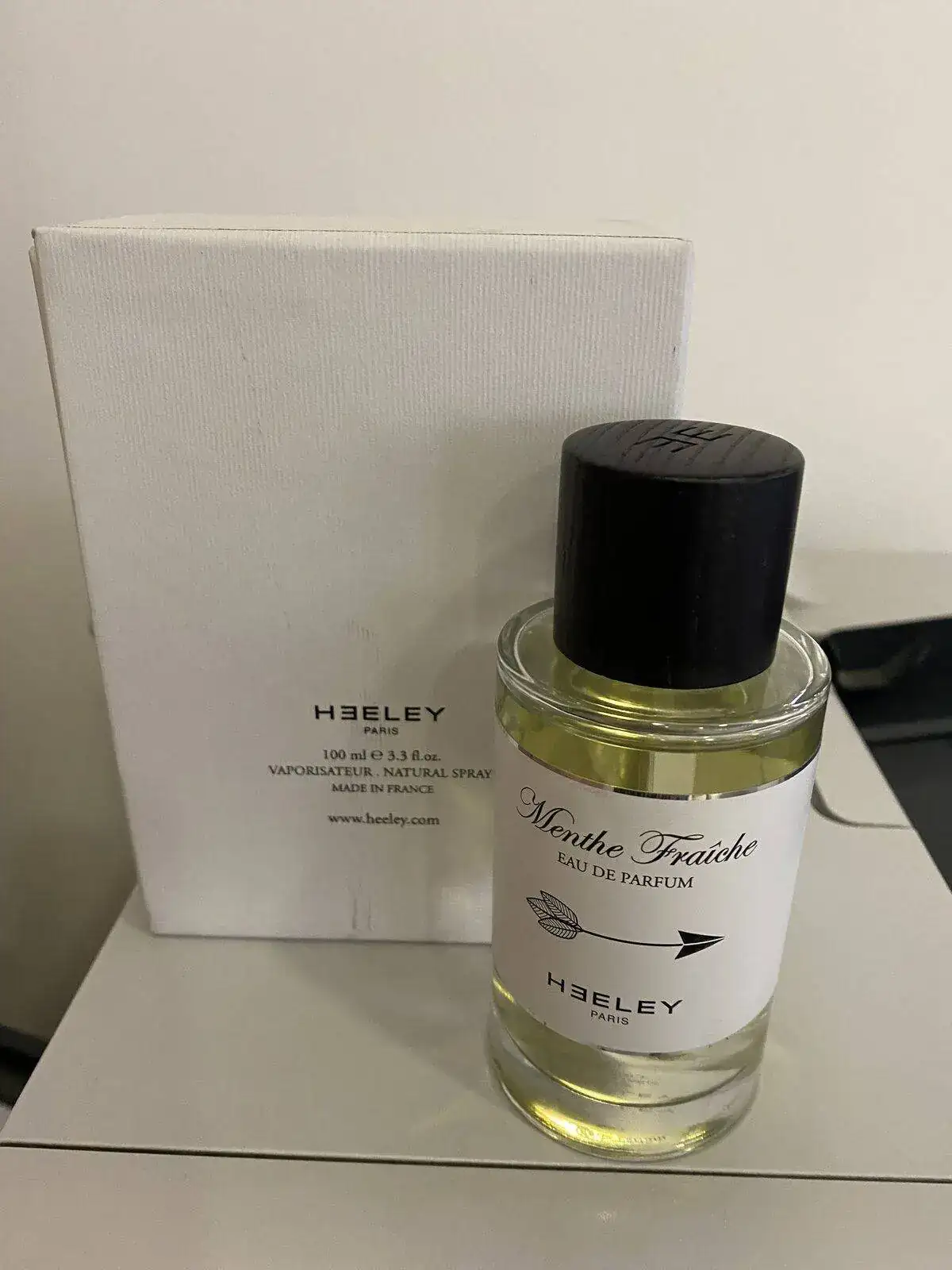 Es de 100 ml acompañada de una caja de Heeley