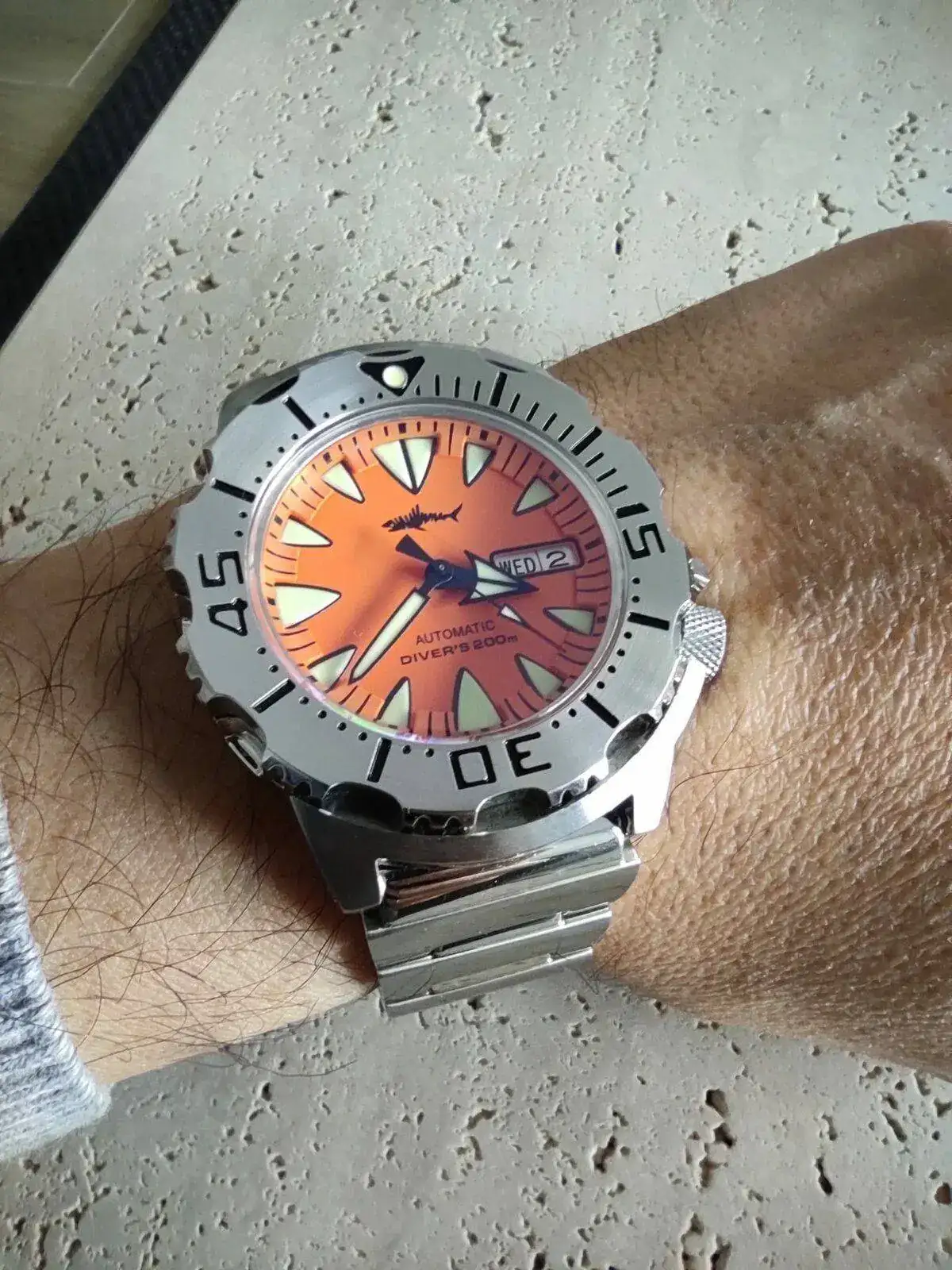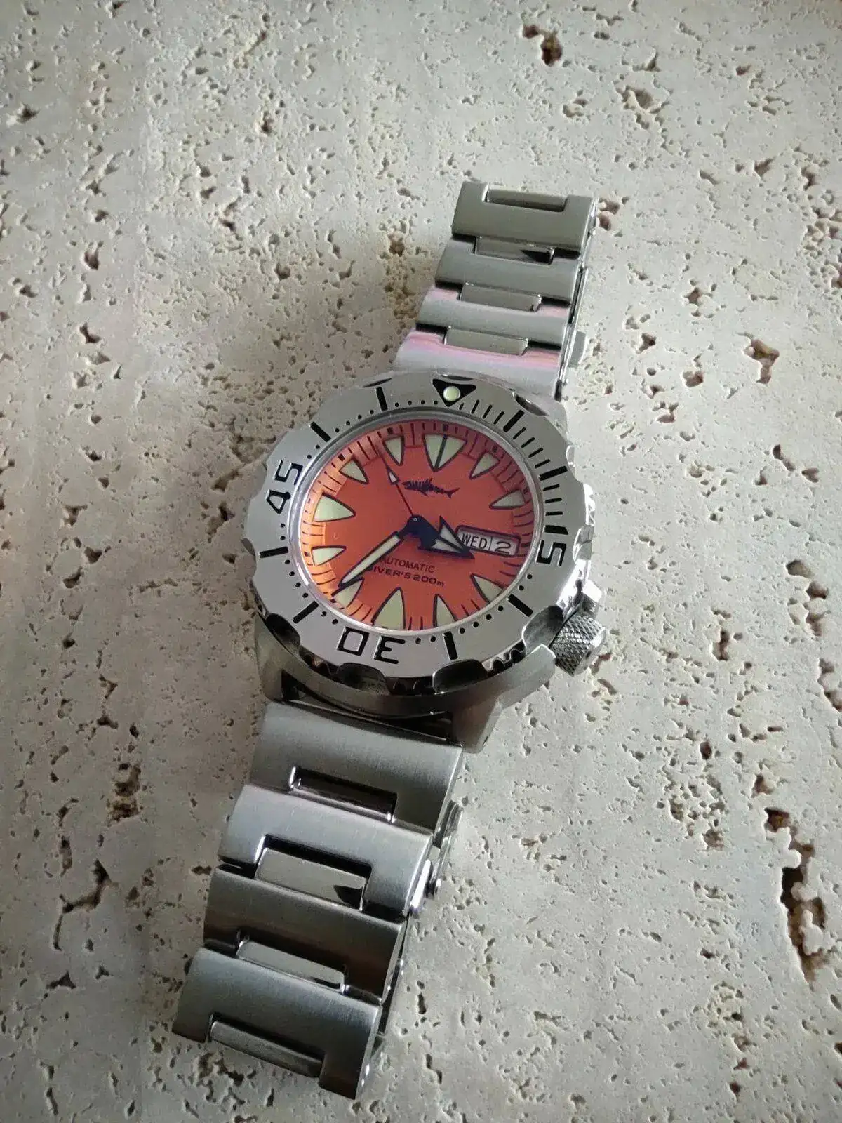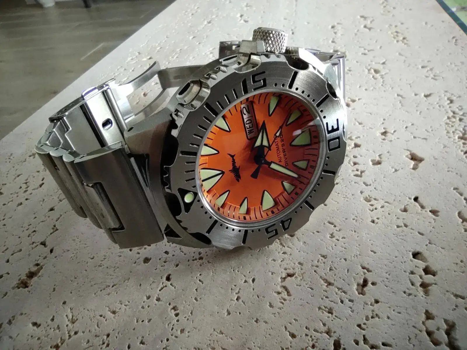 El caso es que siempre me llamó la atención el gran Seiko Monster de 2ª Generación, en naranja y en la versión Vampire. Pues bien, fruto del Black Friday, mis más bien bajas defensas ante la tentación relojil y de andar curioseando videos varias semanas antes sobre esta micromarca y sus más que fieles homenajes, le di al clic al naranja.