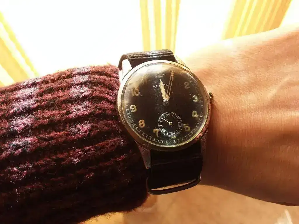 Este Helios en concreto llega desde Ucrania. El vendedor dijo que fue botín de guerra de un veterano, y que llegó a él a través de los familiares de éste.Otro compañero, Joan, me dijo que mi reloj pertenece al tercero de los seis lotes que registró el ejército alemán de la marca Helios, de los que 40399 fueron marcados como DH y usados por la wermatch. Los dos primeros lotes llevaron calibres AS1130, el tercero llevó tanto AS como Precimax, y los últimos sólo Precimax (P300).