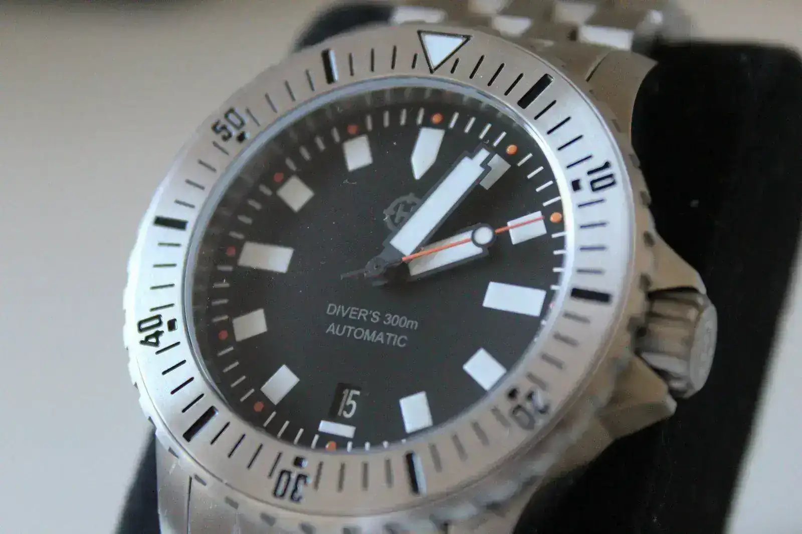 La dotación básica consiste en el reloj con su armis estilo “engineer” y una nato adicional (con el nombre de la marca grabado en una de las hebillas) de la que se puede elegir el color. También incluye dos pegatinas decorativas, un pañuelo de tela negro para limpiarlo, una herramienta para soltar los eslabones y tres tarjetas: una personalizada con tu nombre para agradecerte la compra, otra con la garantía y la última para certificar que ha superado un test de condensación. Yo aparte compré el bisel acabado en acero.