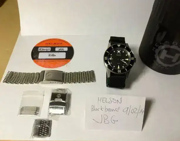 El reloj incluye, correa nylon negra, armis milanesa acero con una extensión original Helson, un deployante de acero también original, garantía sellada en agosto de 2011 y la caja estanca original Helson.