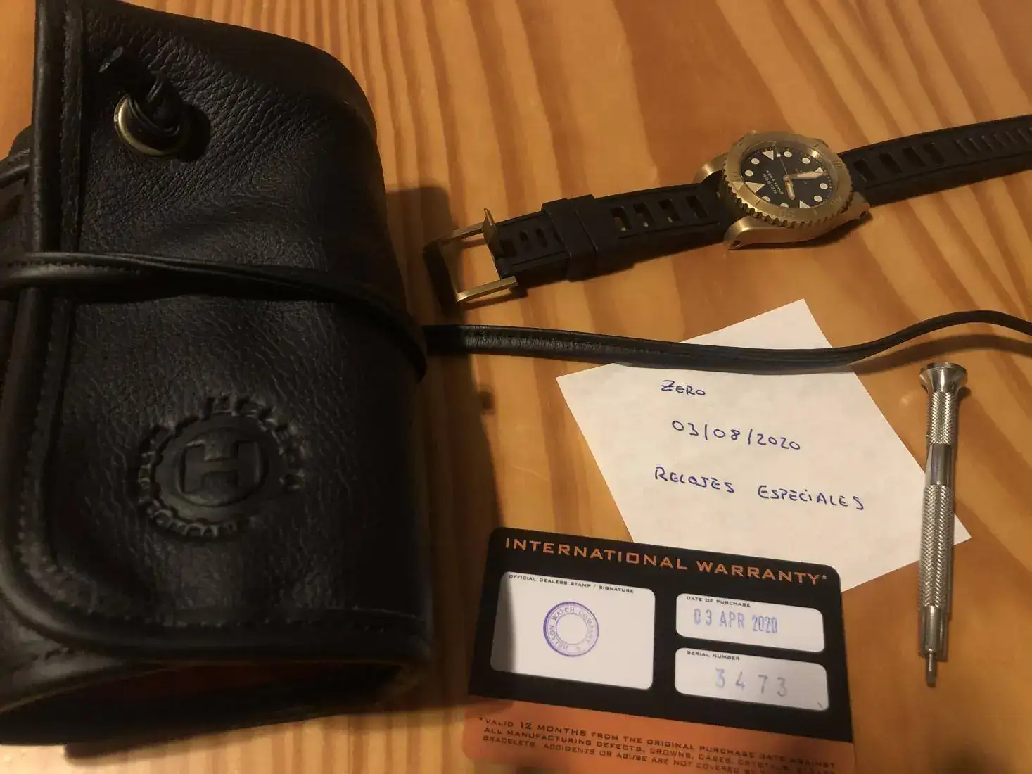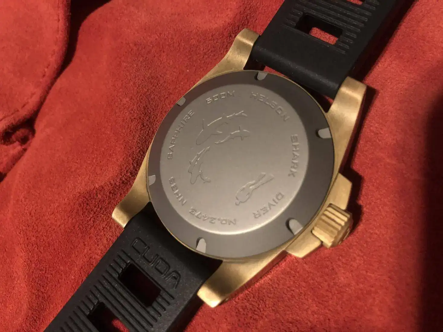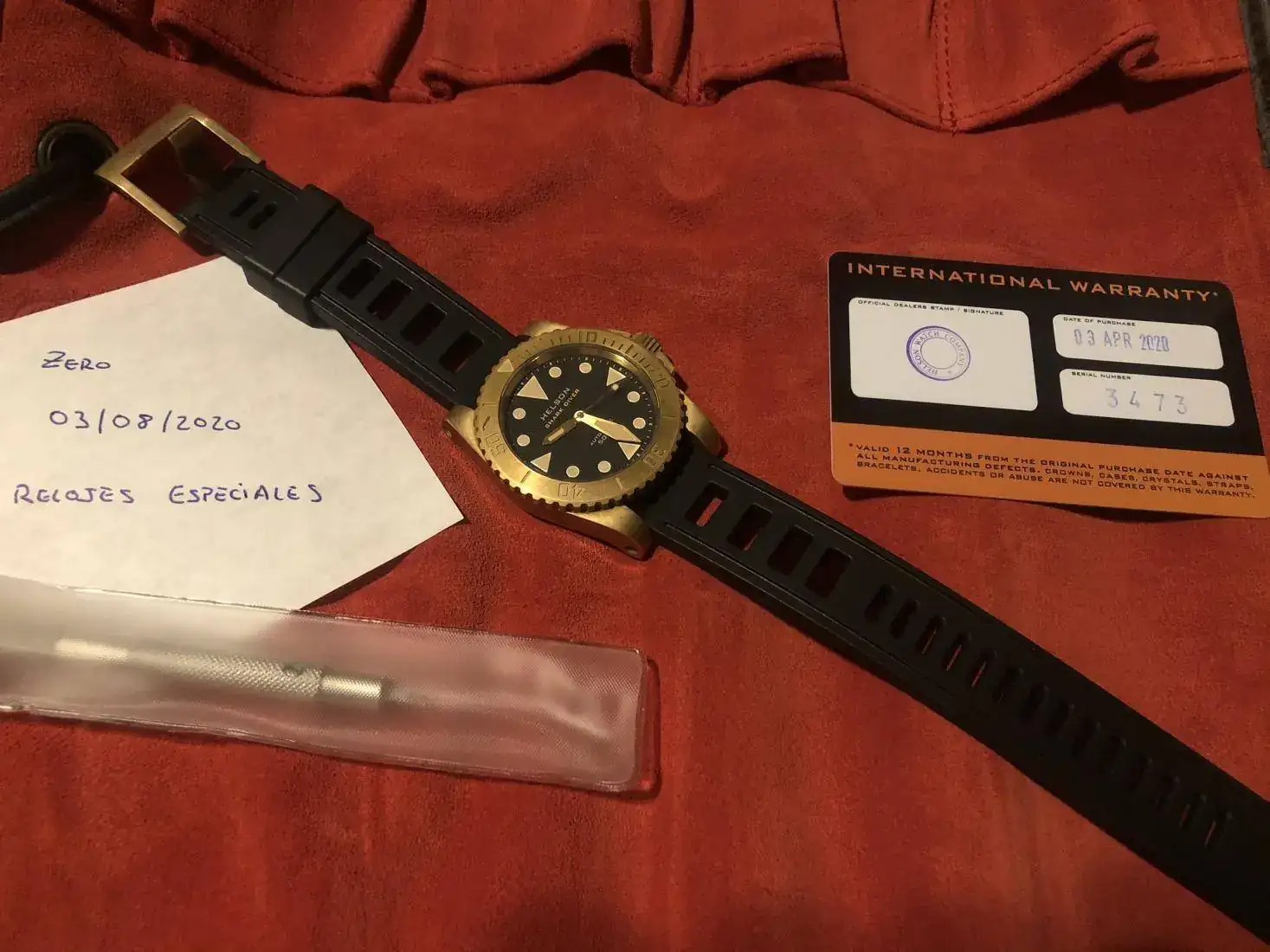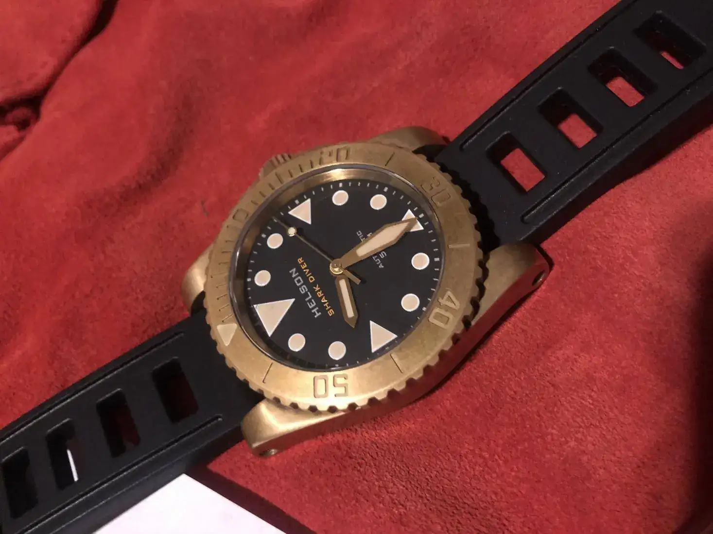 Hola, pongo a la venta este Helson Shark Diver de 40 mm con lumen tostado ahora que está tan de moda. El reloj fue comprado en marzo, su patina es totalmente natural, piscina y dos días de playa, su estado es impoluto, ni un solo arañado al igual que la tapa trasera de titanio también se encuentra inmaculada. La correa de caucho está sin estrenar ya que le estaba esperando una canvas el día que llegó. Incluye el porta relojes de viaje y herramienta para cambio de correa.