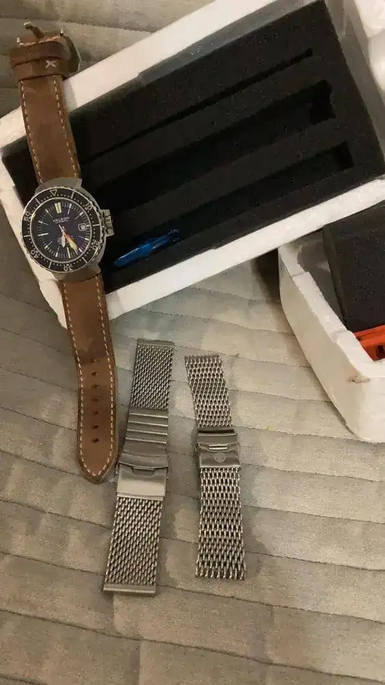 Correa: La milanesa original de Helson apta para muñeuifinos( como 17 mm) y a más, otra gorda universal, más el cuero de las fotoso y una borealis naranja estupenda.