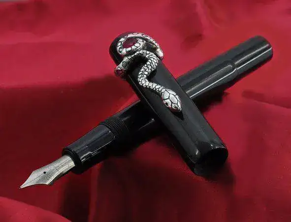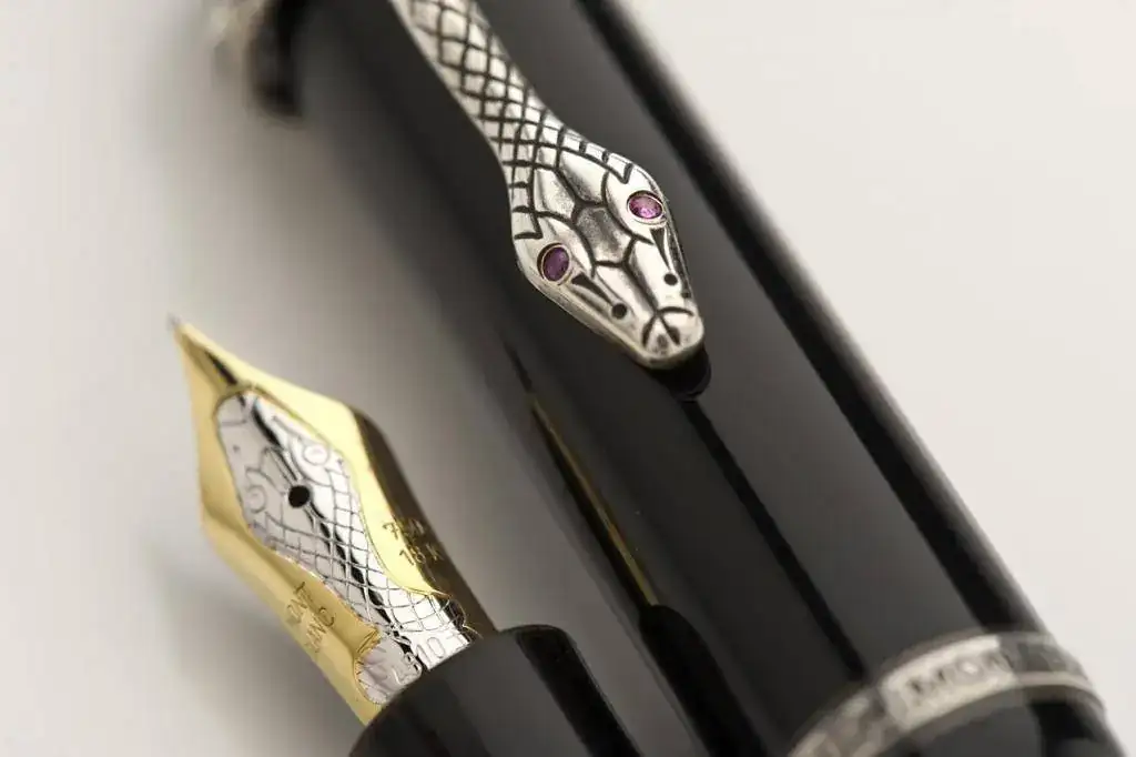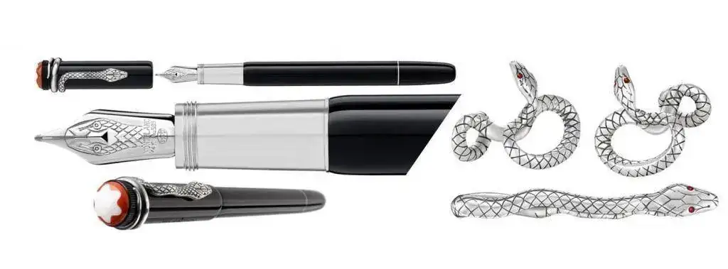 Pero quizá el modelo que más ha hecho por popularizar este elemento decorativo en las plumas fue la edición especial de Montblanc dedicada a Agatha Christie, cuyo clip tiene la mítica serpiente enrollada y en cuyo plumín también aparece la cabeza de un ofidio. Cuando pensamos en plumas con serpientes, este modelo icónico es de los primeros que nos viene a la memoria.