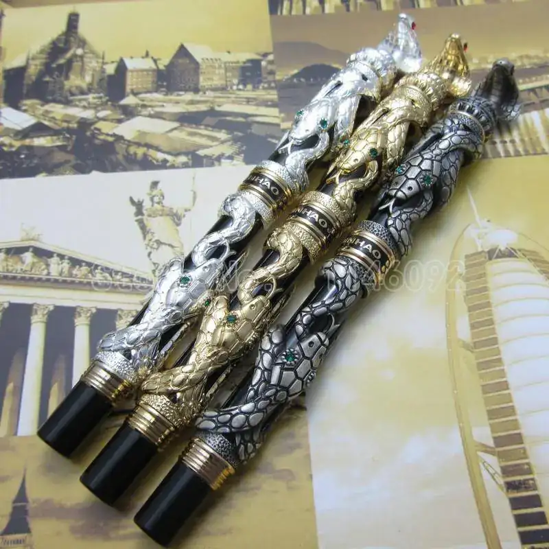 Finalmente, Jinhao no ha querido quedarse fuera de esta monografía y aporta su edición Snake en tres acabados (dorado, plateado y negro), coronada por una cobra expectante.