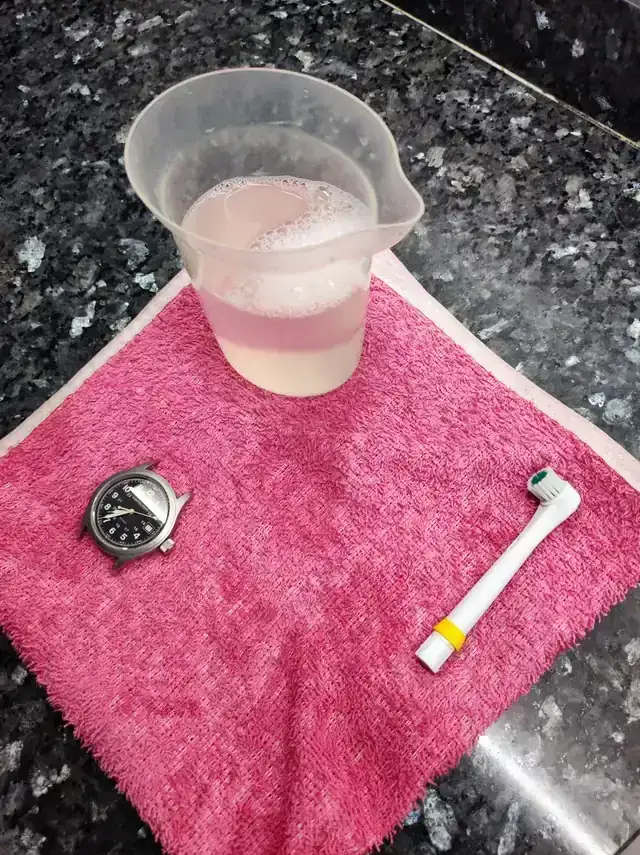 Antes os contaré que el reloj es usado, y ha llegado bastante sucio. Así que aprovechando que tenia la caja sin correa, le he pegado un baño de bienvenida, la típica limpieza con agua caliente jabonosa y cepillo de dientes soft, pongo unas fotos del proceso: