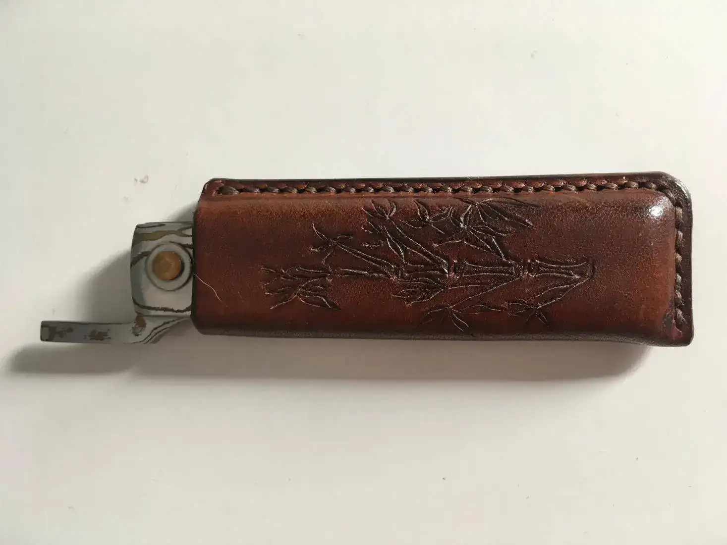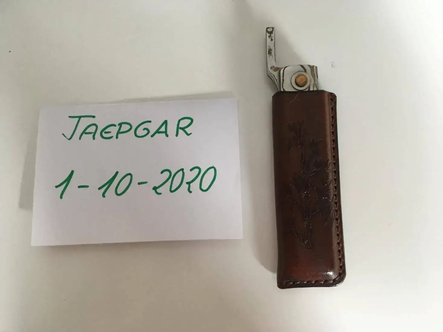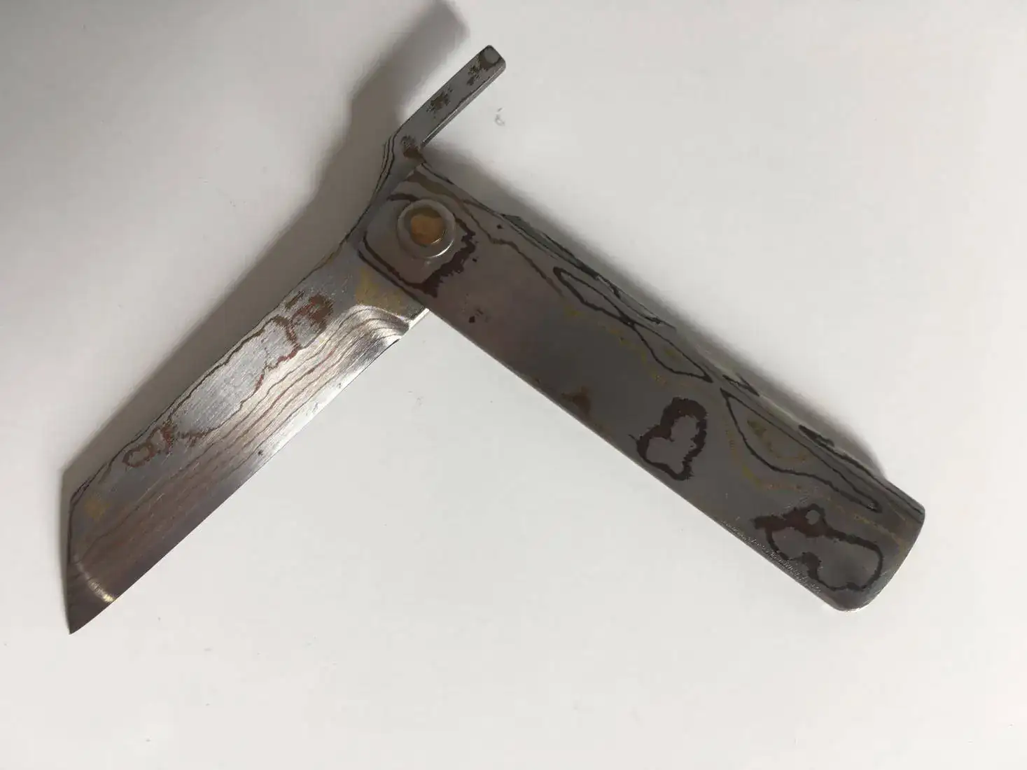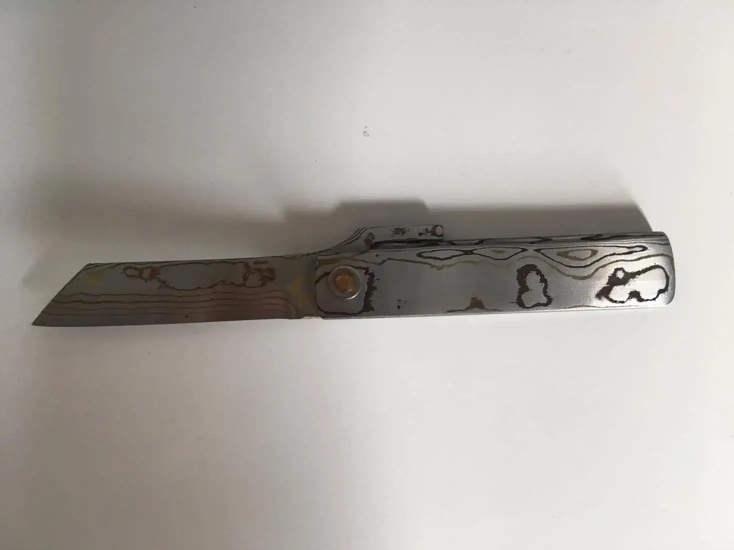 Buenas tardes saco a la venta esta pieza tan especial de mi colección. Se trata de una navaja estilo Higonokami fabricada íntegramente en acero de Damasco combinando láminas de cobre y latón por el reconocido artesano Takeshi Saji. Incluyó en la oferta la funda que mande hacer a medida en piel de primera calidad y grabada con unas cañas de bambú que le quedan impresionantes. El precio de este conjunto son 205€ enviado por correo certificado.