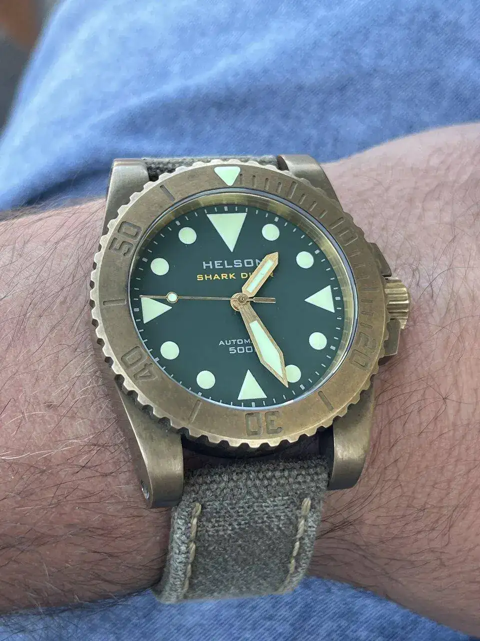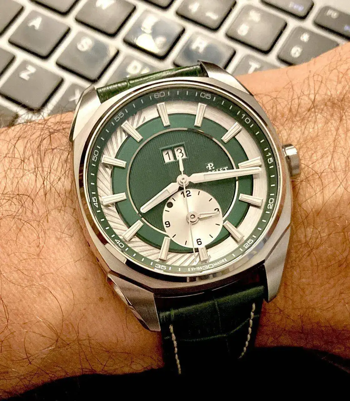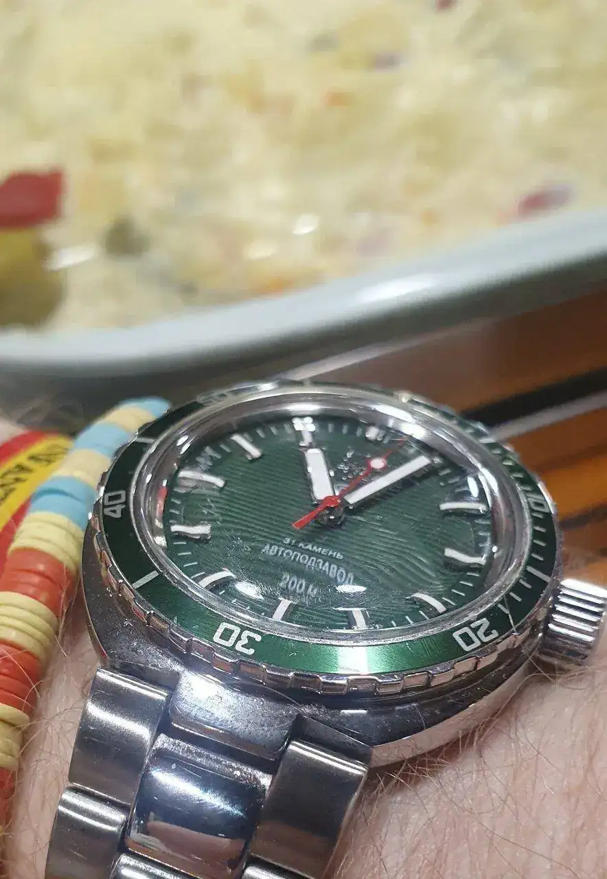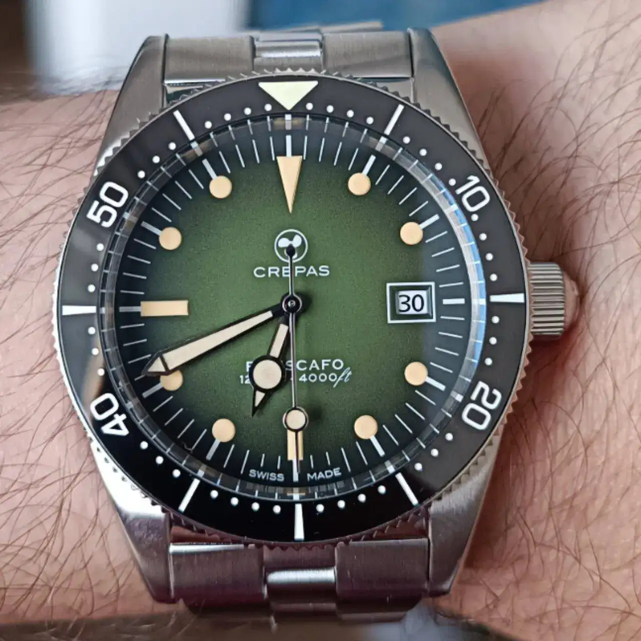 Compartimos el mismo reloj con idéntica esfera.Por aquí, el último en llegar (y verde). Crepas Batiscafo. Es mi primer Crepas, y me ha sorprendido gratamente 😊.