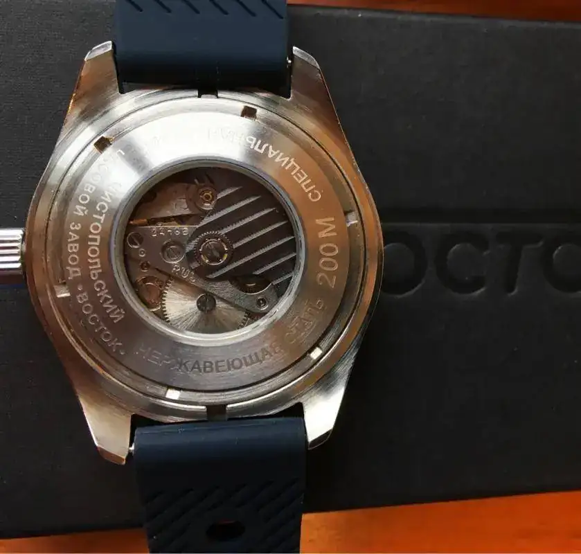 Caja 090 con bisel numerado del 1 al 12. Esfera azul y texto tal o pascual. Fondo con motivo de submarino......