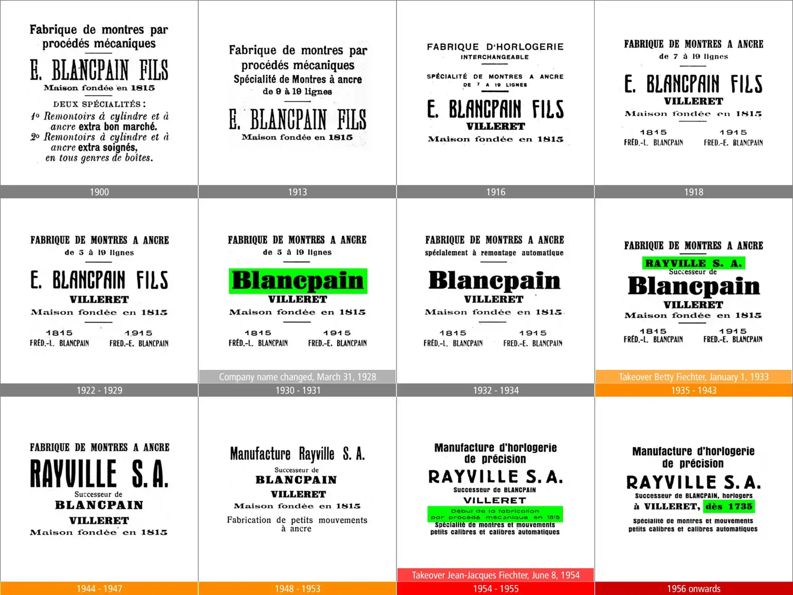 Tras la muerte de Frédéric-Emile Blancpain, su única hija, Berthe-Nellie, pasaba de pelucos y no deseaba dedicarse a la relojería. Al año siguiente, dos miembros del personal más cercanos a Frédéric-Emile, Betty Fiechter (¿veis como era importante?) y André Léal, compraron el negocio. Me parecen muy baratas las bromas de apellidos, pero André Léal, miembro del personal muy cercano al jefe...¿os habeis dado cuenta vosotros también? Prosigamos. Como ya no había ningún miembro de la familia Blancpain al mando de la empresa, los dos asociados se vieron obligados por la ley suiza de aquel entonces a cambiar el nombre de la compañía. La firma se llamaría Rayville S.A., sucesores de Blancpain, siendo "Rayville" un anagrama fonético de Villeret. Era la misma empresa, el cambio de nombre fue un formalismo. Cosas de suizos.