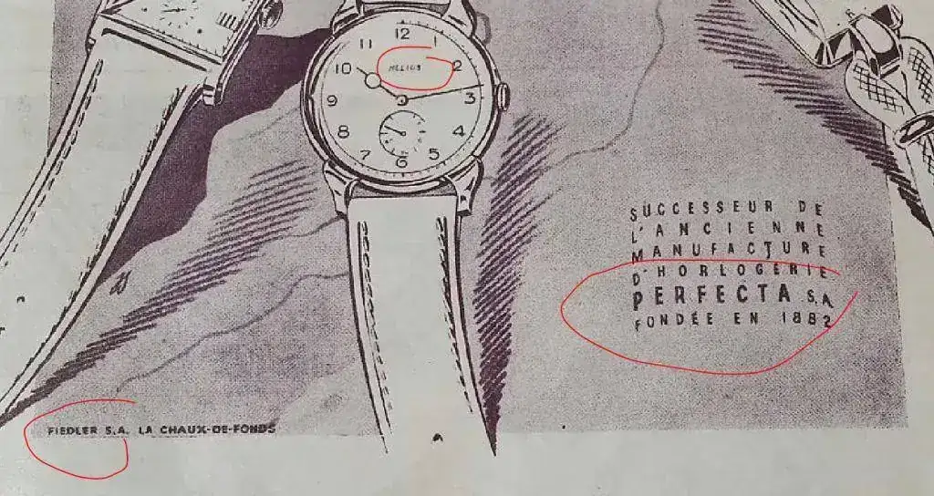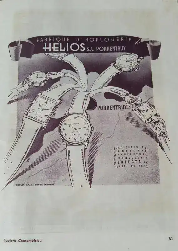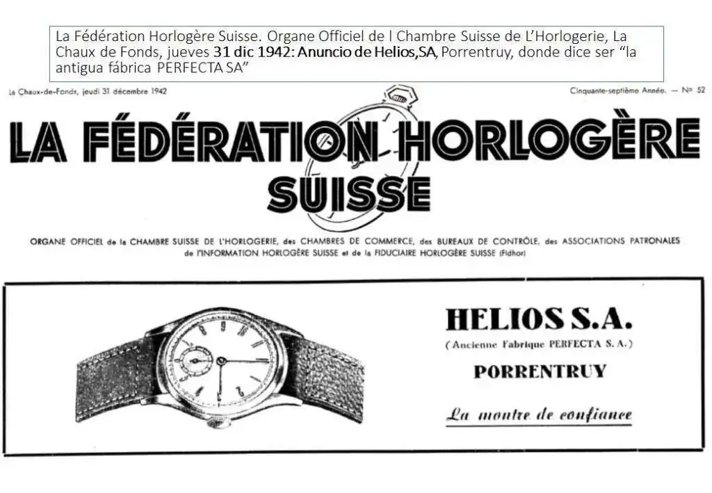 “La Fédération Horlogère Suisse. Organe Officiel de la Chambre Suisse de L’Horlogerie”, de La Chaux de Fonds, del 31 de diciembre 1942, publica un anuncio de Helios,SA, Porrentruy, donde dice ser “