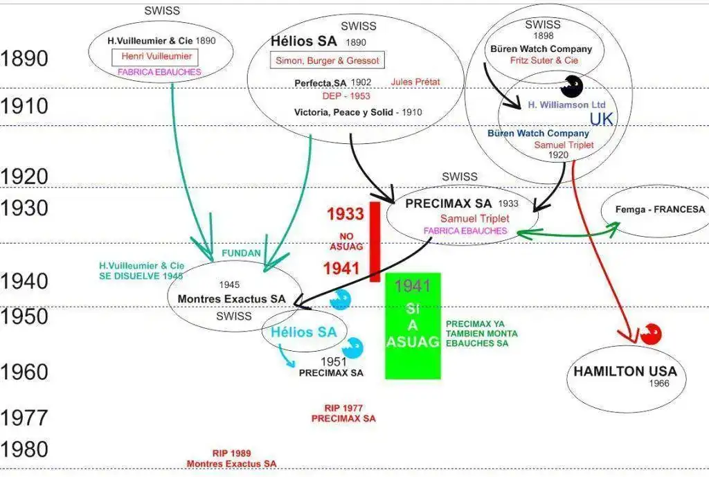 Puesto que hay una gran parte de datos que ya son conocidos, están contrastados y aquí dicen lo mismo, las novedades que ahora aparecen, creemos que es razonable que las aceptemos como correctas: H. Vuilleumier, propietario de H.Vuilleumier & Cie, era accionista de Hélios. junto con ésta última, fundaron Exactus en 1945 y absorbieron la primera. Además, también se asociaron con Perfecta y Precimax par producir relojes bajo diversas marcas.