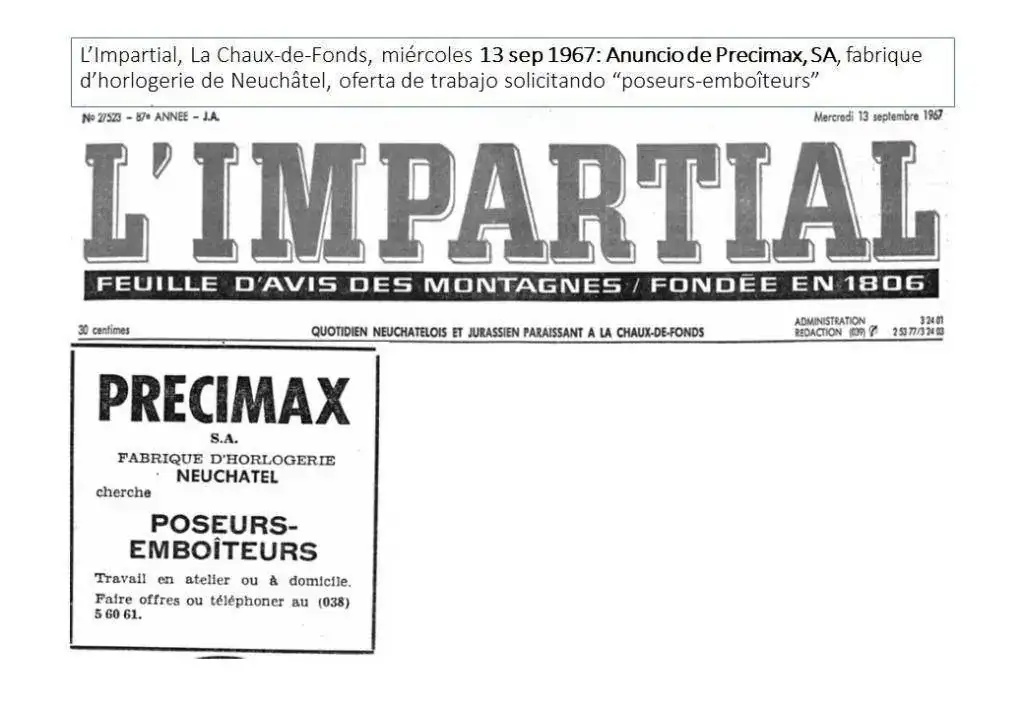 “L’Impartial”, La Chaux-de-Fonds, el 13 de septiembre de 1967, publica un nuncio de Precimax, SA, fabrique d’horlogerie de Neuchâtel, con una oferta de trabajo solicitando “poseurs-emboîteurs”: