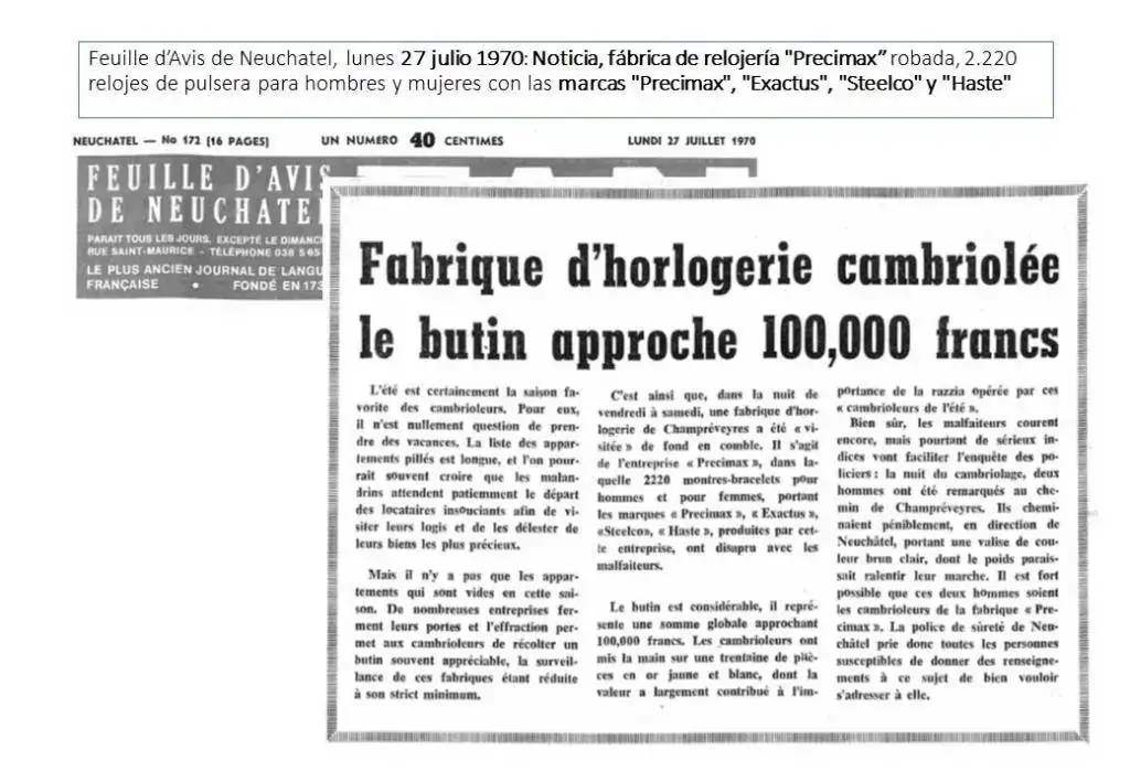 “Feuille d’Avis de Neuchatel”, del 27 de julio de 1970, publica la noticia, Fábrica de relojería "Precimax” robada, 2.220 relojes de pulsera para hombres y mujeres con las marcas "Precimax", "Exactus", "Steelco" y "Haste":