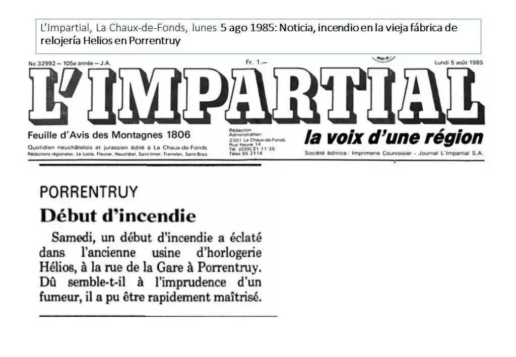 “L’Impartial”, La Chaux-de-Fonds, el 5 de agosto de 1985 se publica la noticia del incendio en la vieja fábrica de relojería Helios en Porrentruy: