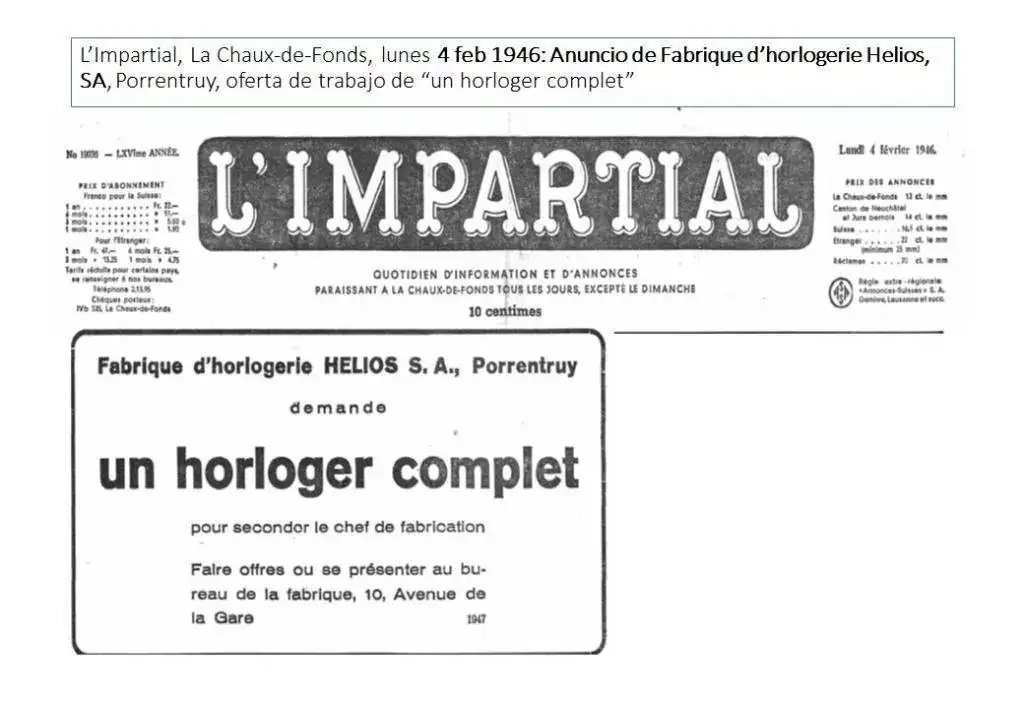 “L’Impartrial”, de La Chaus de Fonds, del 4 de febrero de 1946, publica un anuncio de Helios SA de Porrentruy con una oferta de trabajo para “