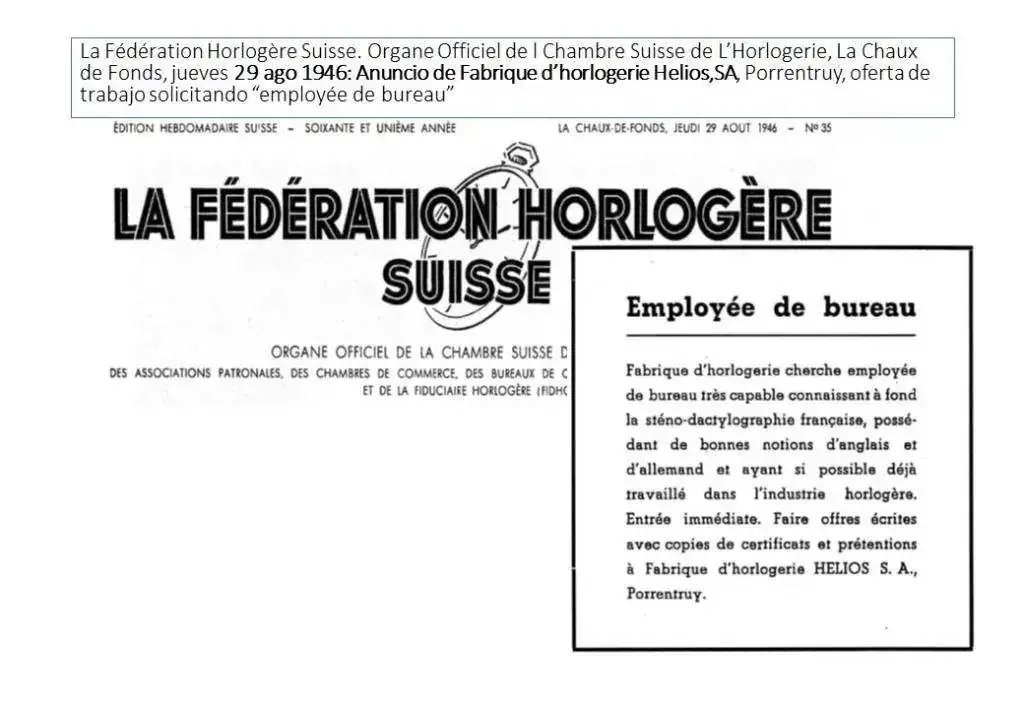 “La Fédération Horlogère Suisse. Organe Officiel de la Chambre Suisse de L’Horlogerie”, de La Chaux de Fonds, el 29 de agosto de 1946, publica un anuncio de Fabrique d’horlogerie Helios,SA, de Porrentruy, con una oferta de trabajo solicitando “