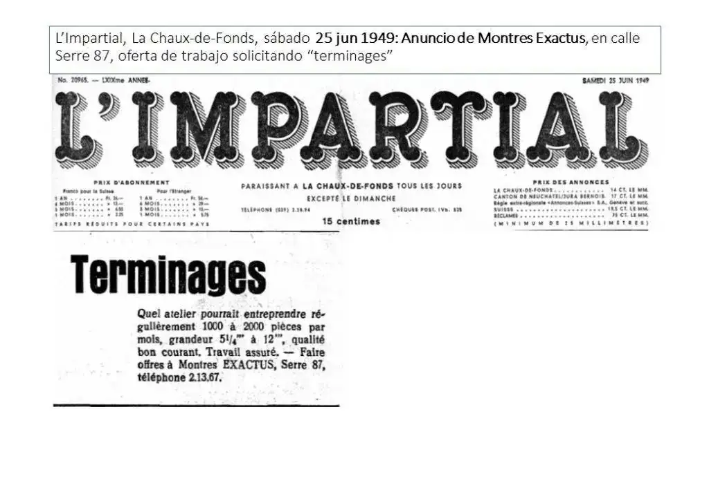 “L’Impartial”, de La Chaux-de-Fonds, del 25 de junio de 1949, publica un anuncio de Montres Exactus, en calle Serre 87, con una oferta de trabajo solicitando “terminages”: