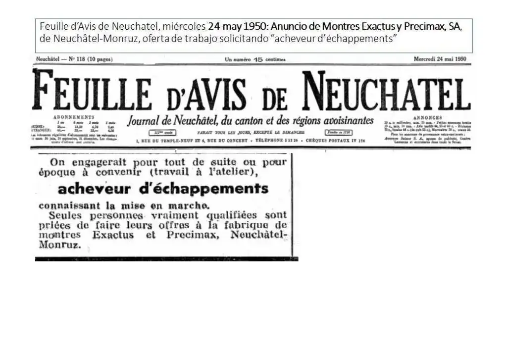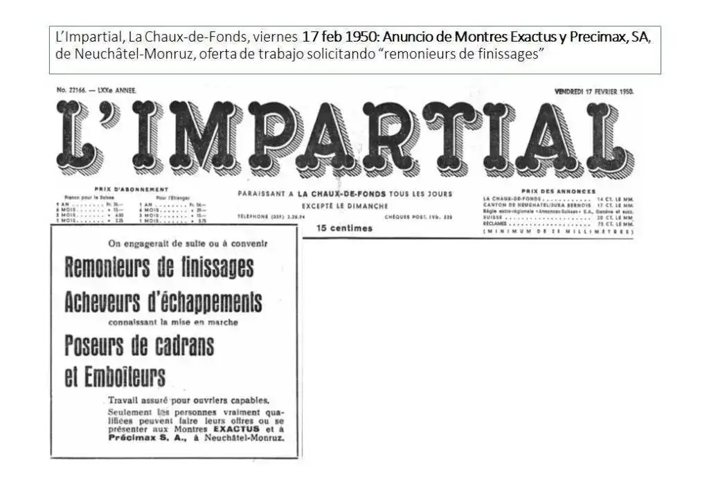 “L’Impartial”, de La Chaux-de-Fonds, el 17 de febrero de 1950, publiac un anuncio de Montres Exactus y Precimax, SA, de Neuchâtel-Monruz, con una oferta de trabajo solicitando “remonieurs de finissages”:
