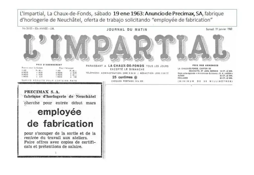 “L’Impartial”, de La Chaux-de-Fonds, del 19 de enero de 1963 publica un nuncio de Precimax, SA, fabrique d’horlogerie de Neuchâtel, con una oferta de trabajo solicitando “employée de fabrication”: