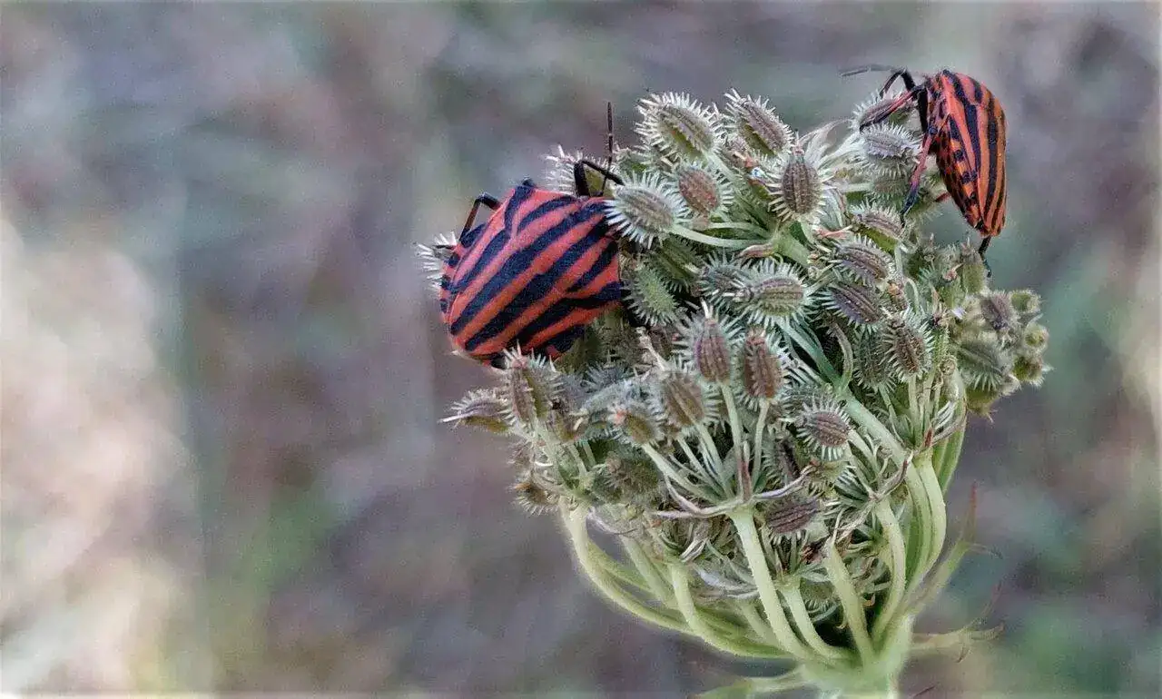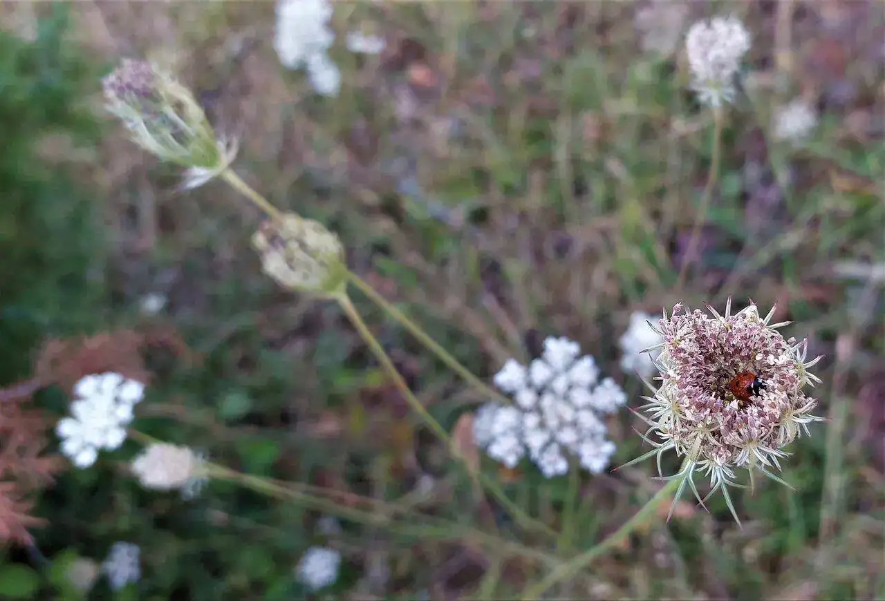 Se trata de las umbelas florales cerradas de Daucus o zanahoria silvestre, plantas extremadamente abundantes, una auténtica plaga en verano y aparentemente muy feúchas las pobres, nunca las había fotografiado pero a falta de otros elementos mas interesantes me acerqué a una de ellas pudiendo comprobar que contienen un micro mundo de colores y texturas sorprendente