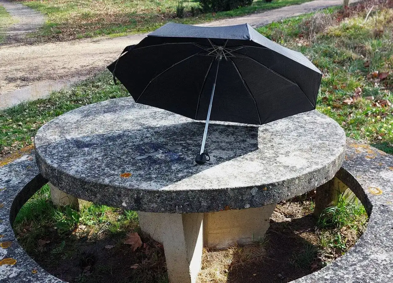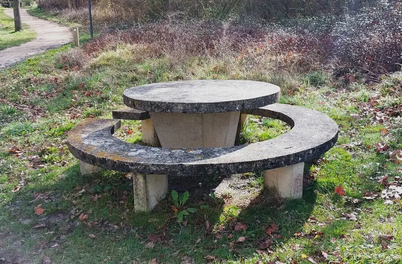 En una zona del anillo verde de nuestra ciudad se encuentran unas mesas de piedra muy antiguas que llevan ahí toda la vida. Tras tantos años la misma piedra plagada de líquenes y otras manchas de la edad son ya en si un fondo muy bueno para las fotografías, pero en una de ellas existen unos restos de pintura azul, resultado probablemente de alguna travesura de niños o no tan niños, con el paso del tiempo y la ayuda de la lluvia y del sol se han suavizado y prácticamente se han integrado en la piedra.