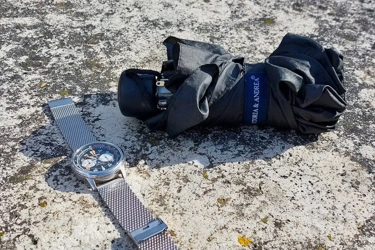 Localizado el objetivo solo son necesarios dos elementos, el reloj y un paraguas, pues en un día como el de hoy con un sol radiante es imposible sacar una foto sin “quemar”.