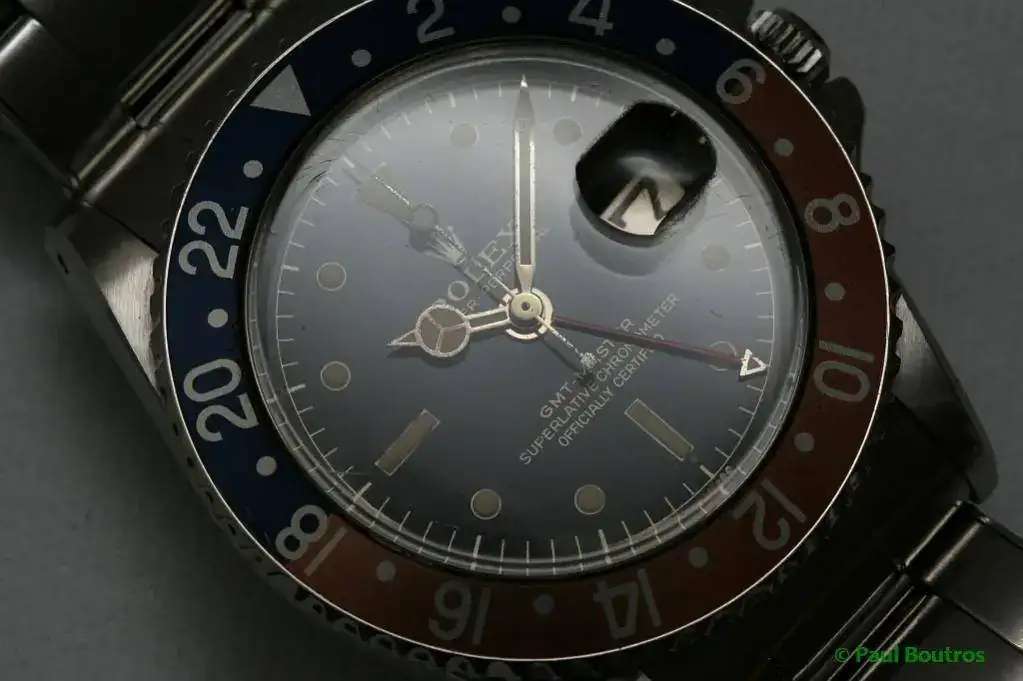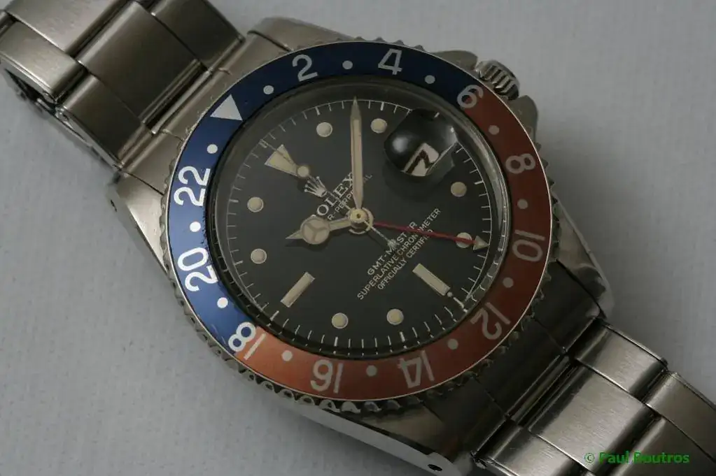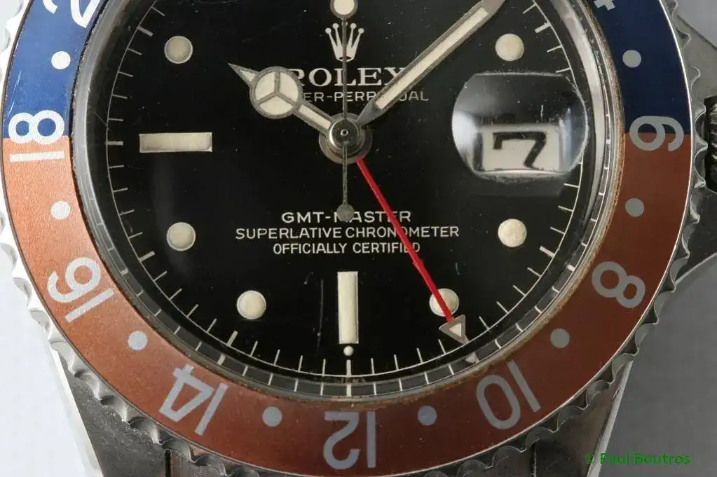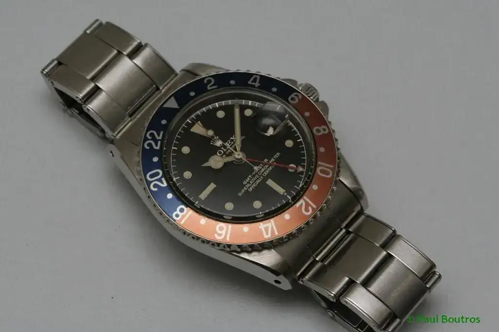 El GMT Master 1675 es un clásico de la colección vintage de Rolex. A pesar de haber estado en producción 21 años, de 1959 a 1980, el gran número de variantes lo hace una de las referencias que da más juego a los coleccionistas y entusiastas. Protectores de corona, evolución en el lumen, esferas brillantes y mate, letras doradas o blancas, indíces pintados más pequeños al principio y grandes despues, oro o mixto, y que decir de la evolución del brazalete.
