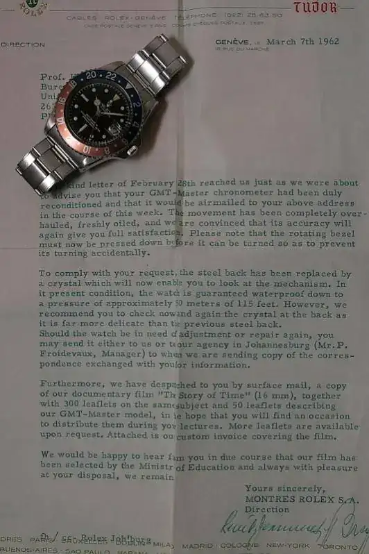 Contra todo lo imaginable, Rolex accedió a la petición. El reloj y los cambios están perfectamente documentados como se muestra en la carta que acompañó a ese GMT Master en 2008, cuando fue subastado.