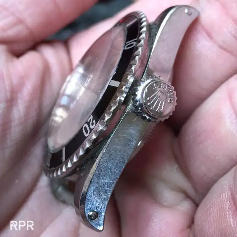 Un detalle de la corona Brevet, de 8mm, la primeraque soportó 200m. Notar los cracks en el plexi, fruto de la acción del radio y las inclemencias del tiempo: