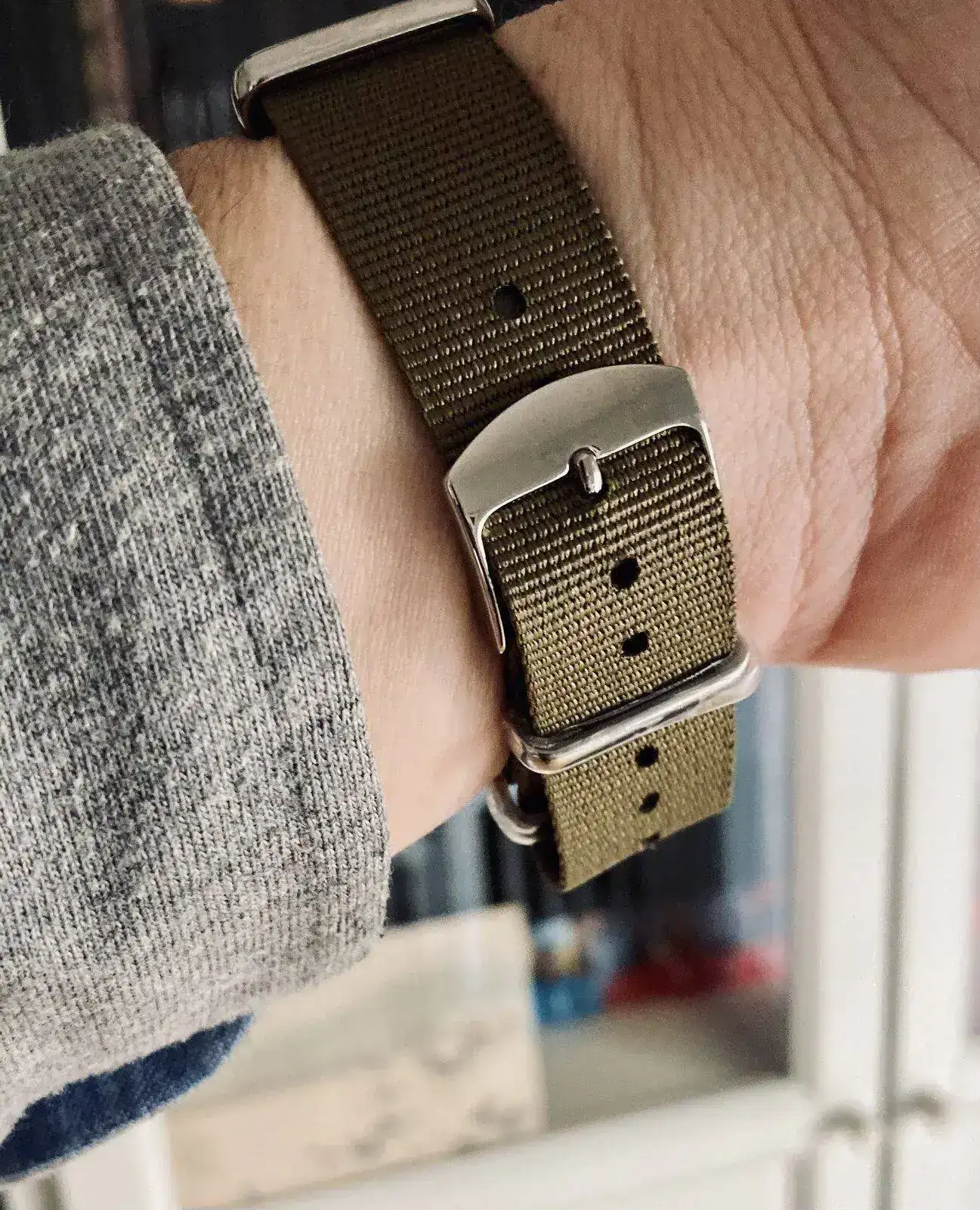 El coste es irrisorio, el porte ha sido tan lento que ya me había olvidado que lo había comprado, no ha habido problema alguno de aduana, ha llegado por vía postal y la correa era tan infame como cabría esperar, por lo que lo primero ha sido cambiarla; junto con sus pasadores; por una NATO Military Green de su talla que andaba por ahí suelto y que no recuerdo para qué reloj compré.